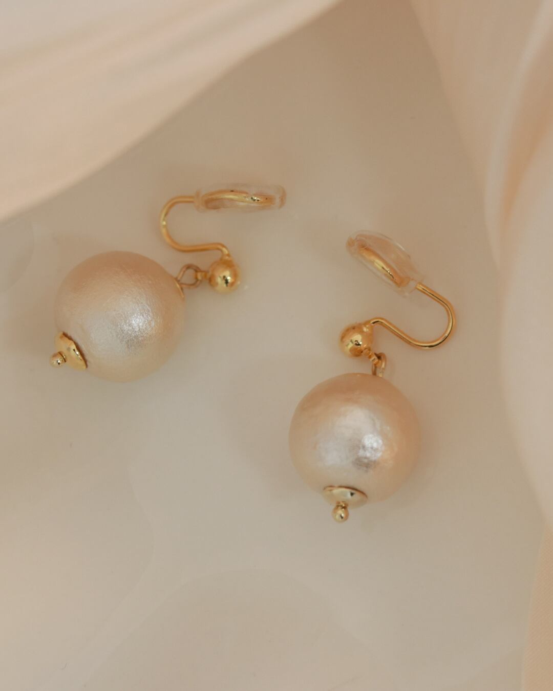 ふんわりとした質感が魅力の、コットンパール風ゴールドピアス。約14mmの存在感あるサイズながら、軽やかなつけ心地でデイリーにも特別な日にもぴったり。ピアスとイヤリングから選べる2タイプ展開です。