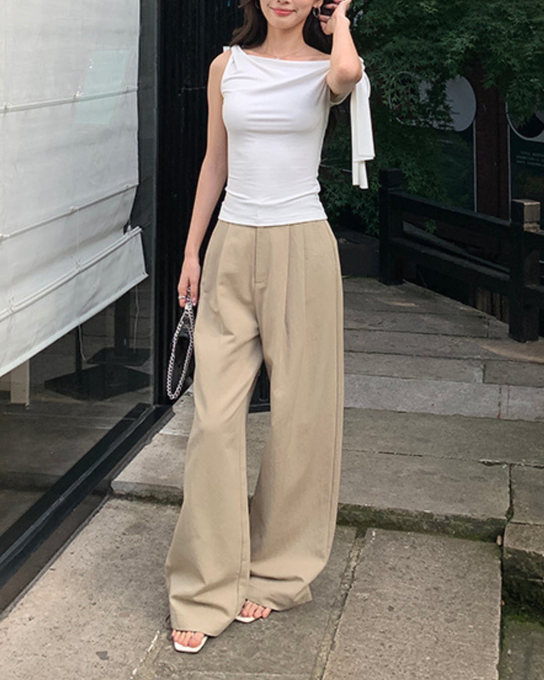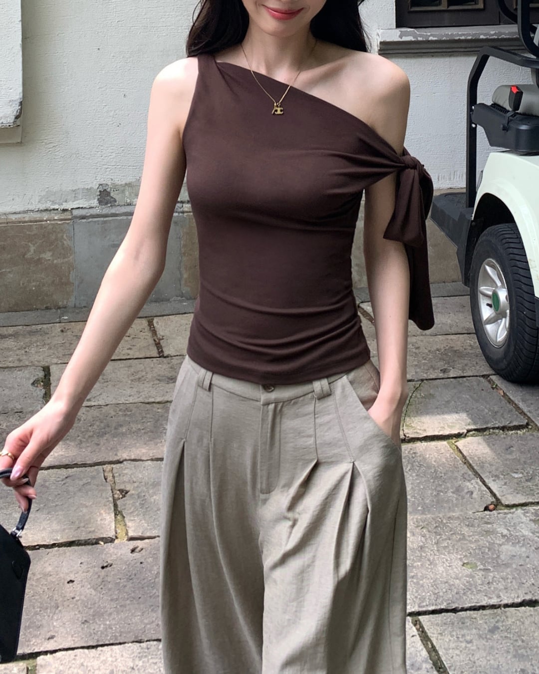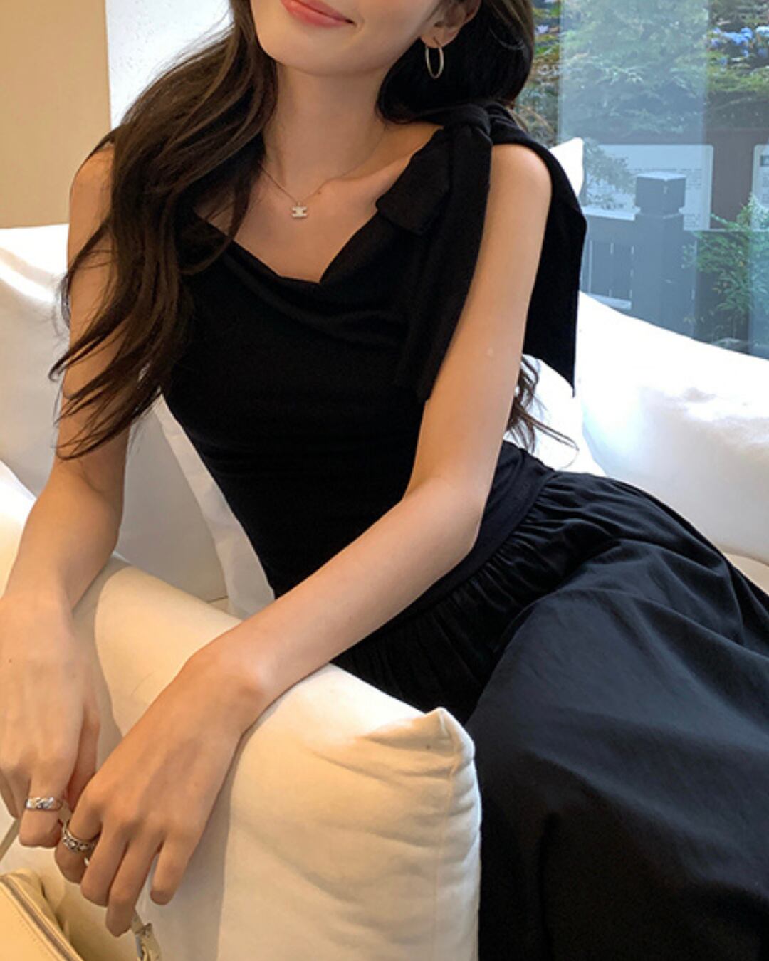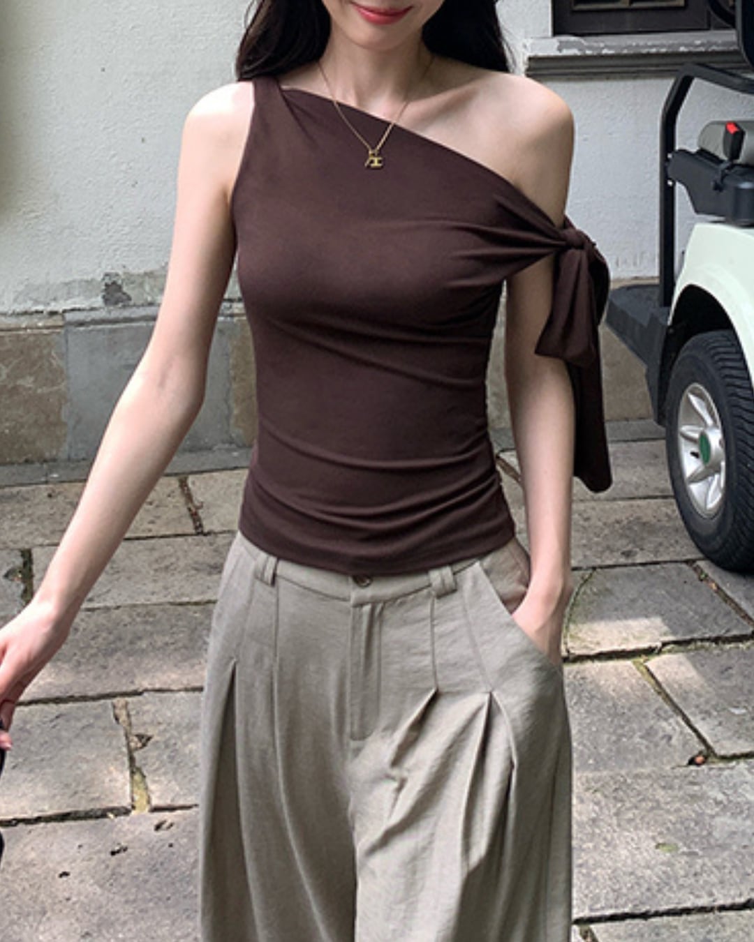 片側に大きく結ばれたリボンが印象的な、フェミニンムード漂うワンショルダートップス。肩やデコルテを美しく見せてくれる斜めネックと、ボディにフィットするシルエットで上品な色気を演出。カジュアルなパンツ合わせでも、コーデが一気に洗練された印象に。夏のお出かけやデートにもぴったりな一枚です。