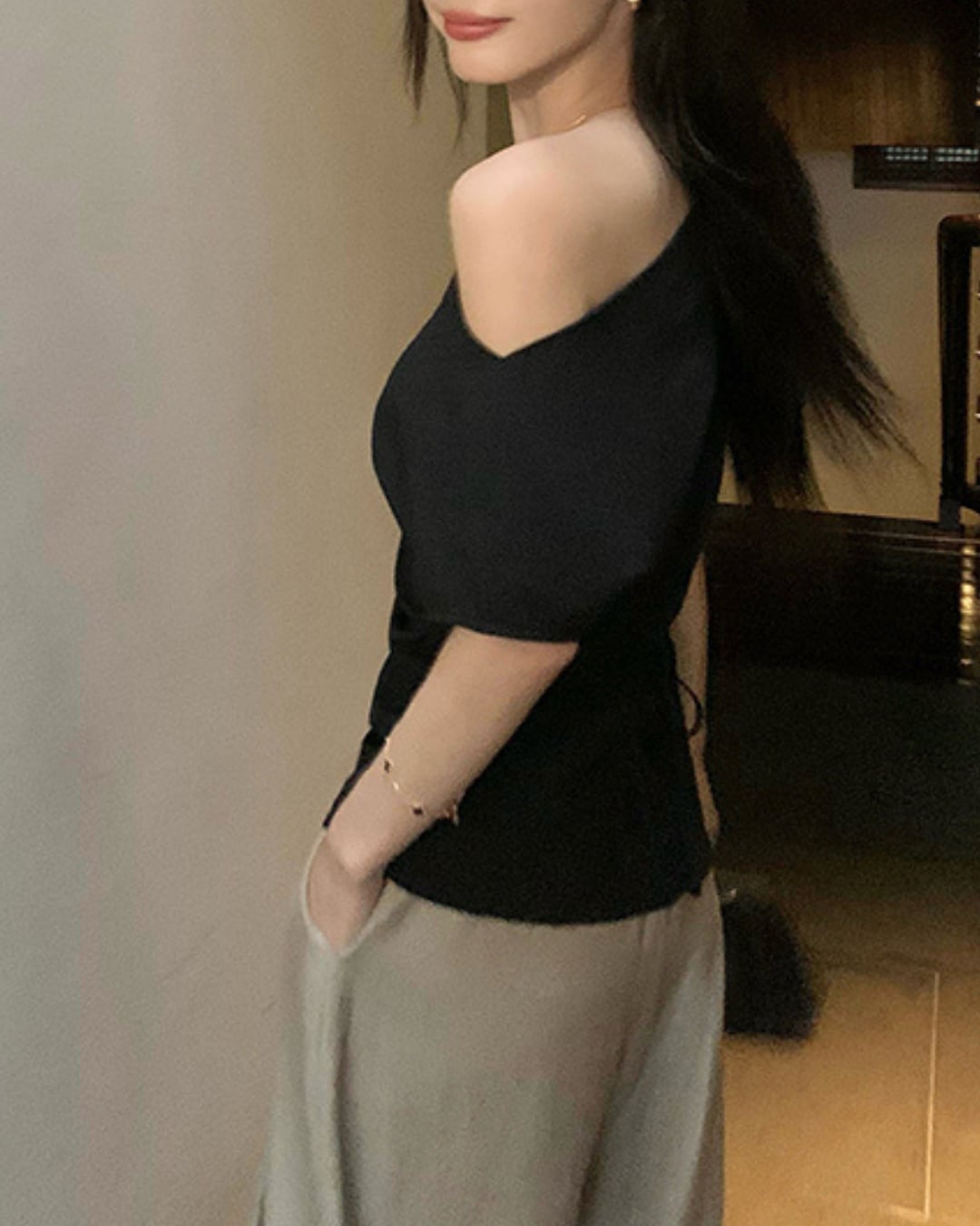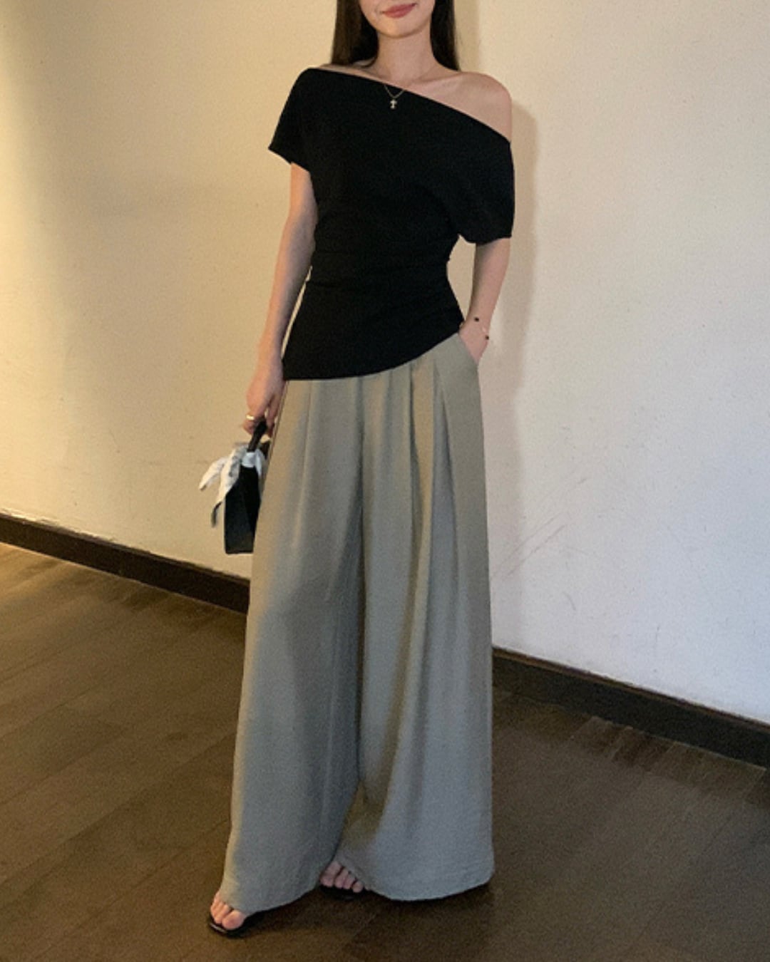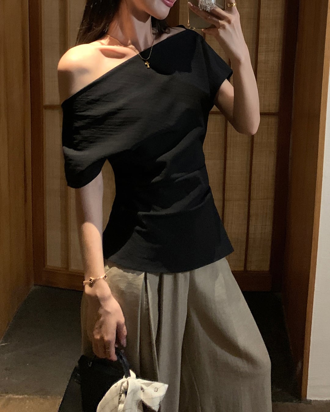 美しいデコルテラインを魅せるワンショルダー風のシルエットが印象的なトップス。柔らかく軽やかな生地は肌なじみがよく、通気性も抜群。上品な落ち感とフィット感で、大人の抜け感スタイルを演出してくれます。モノトーンコーデやきれいめカジュアルにぴったりの1枚です。