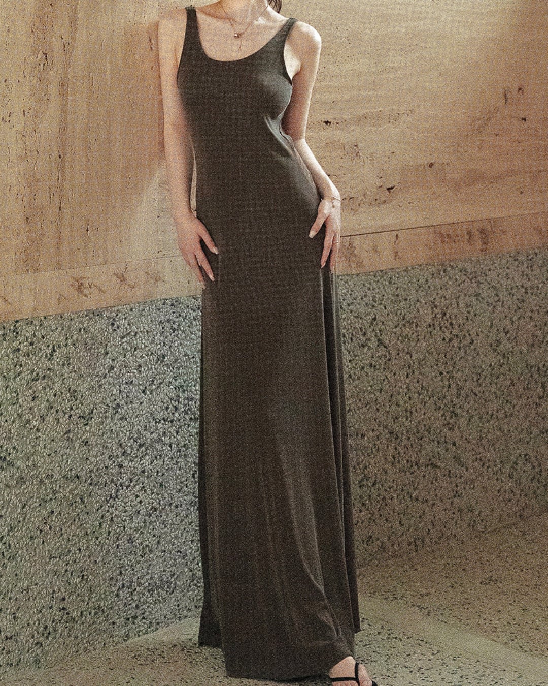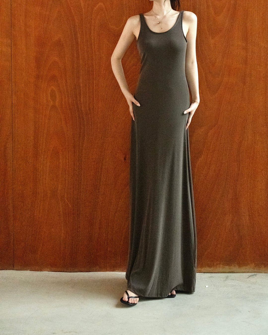 シンプルで洗練されたUネックデザインのマキシドレス。無袖のシルエットは夏の暑い日にも快適で、リラックスした着心地を提供します。どんなコーディネートにも合わせやすく、シンプルな中にも美しさを引き出してくれる一着です。