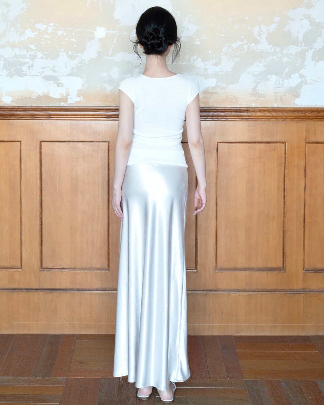 上品な光沢感を持つサテン素材で仕立てたマキシスカート。シンプルでありながら、シルエットが美しく、足元を引き立てるデザインです。ブラックとアーモンドホワイトの2色展開で、どちらもシーンを選ばずに着こなせます。