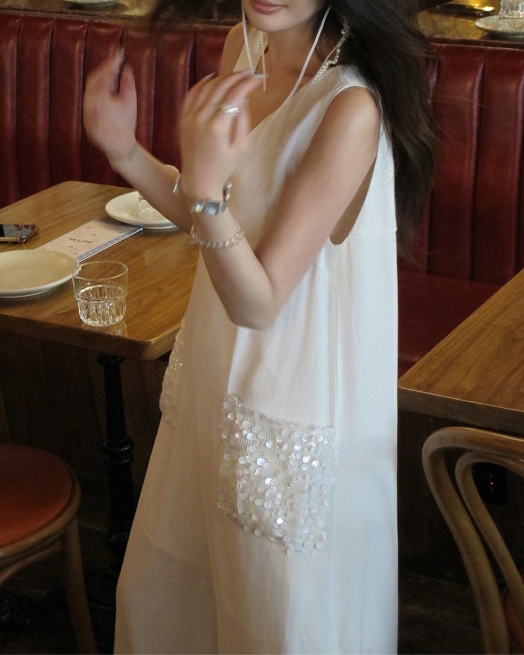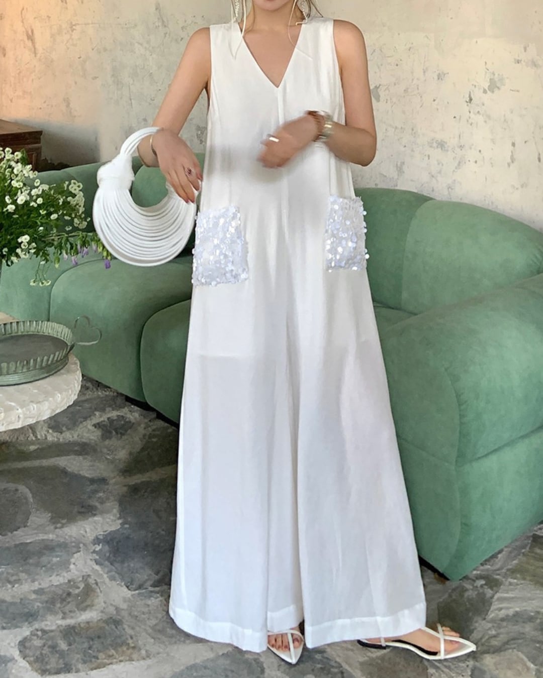 洗練されたミニマルなデザインに、存在感のあるスパンコールポケットをあしらったジャンプスーツ。ナチュラルなリネン混素材が肌に心地よく、暑い季節にもさらりと着こなせます。ワイドシルエットと深めのVネックでスタイルアップ効果も抜群。モード感のある大人のリラックススタイルにぴったりの1着です。