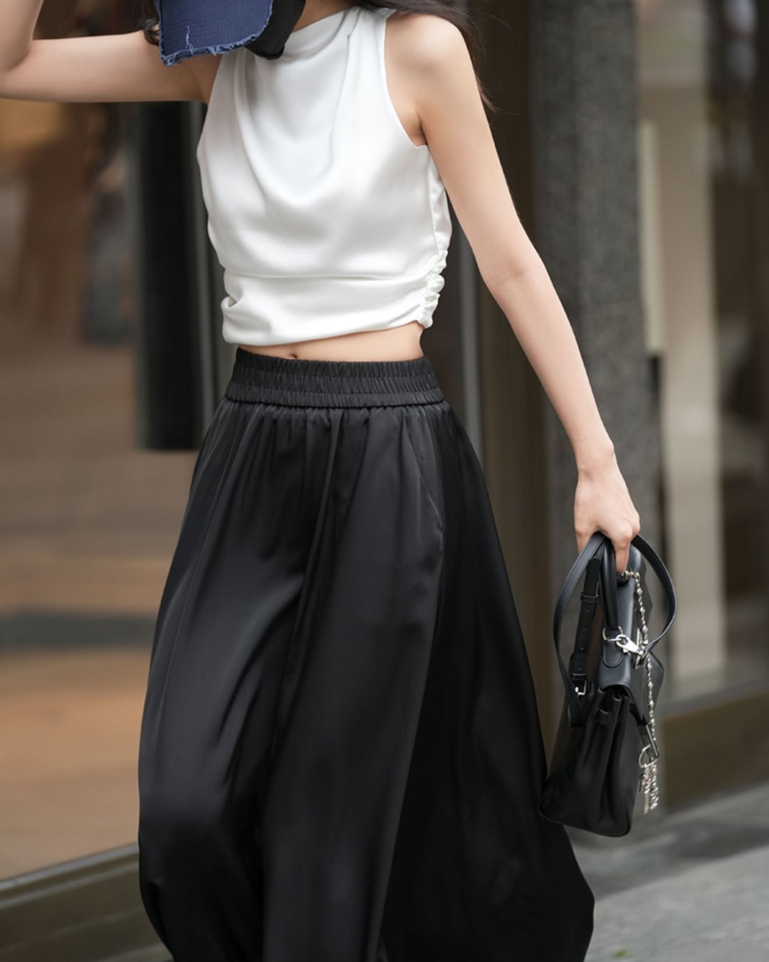光沢のあるサテン素材を使用したショート丈ノースリーブトップス。シンプルながらも上品なシルエットで、モードにもカジュアルにも着こなせる万能アイテム。ハイウエストパンツやスカートと合わせてスタイリッシュに。