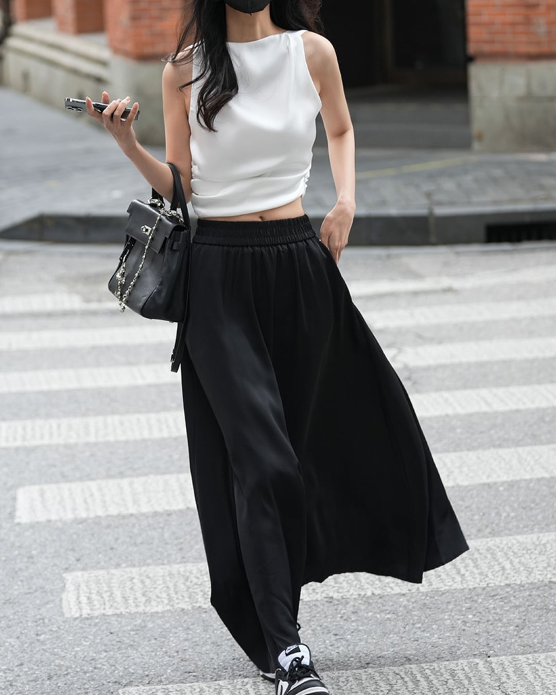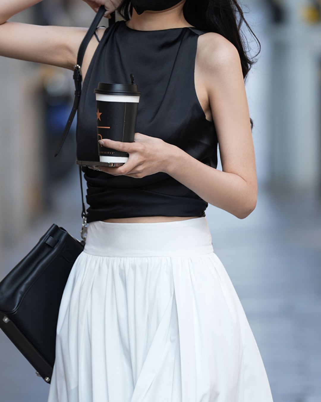 #サテン #ノースリーブ #ショートトップス #ホワイトコーデ #モードスタイル #ストリートミックス