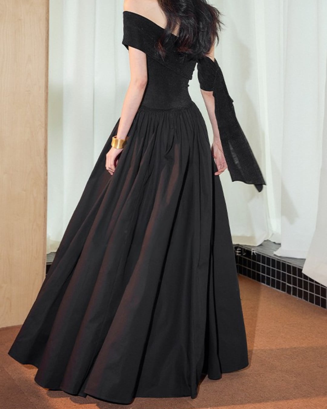 クラシカルでエレガントな印象のオフショルロングワンピース。上半身はフィット感のあるシルエットで美しくボディラインを際立たせ、ウエストから広がるドラマチックなフレアスカートが歩くたびに優雅に揺れます。サイドに施された装飾がさりげない華やかさを添え、パーティーや特別なシーンで主役級の存在感を放ちます。