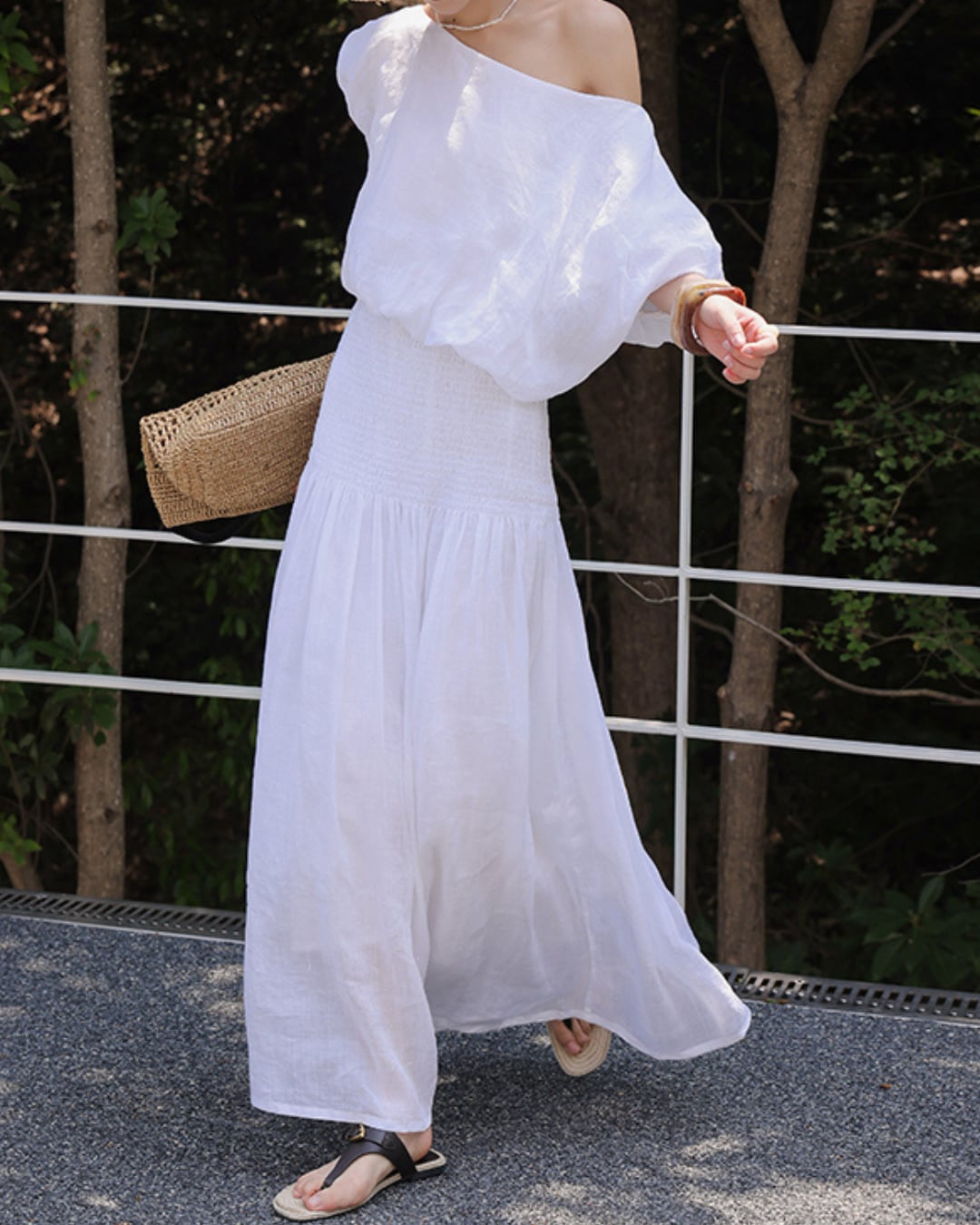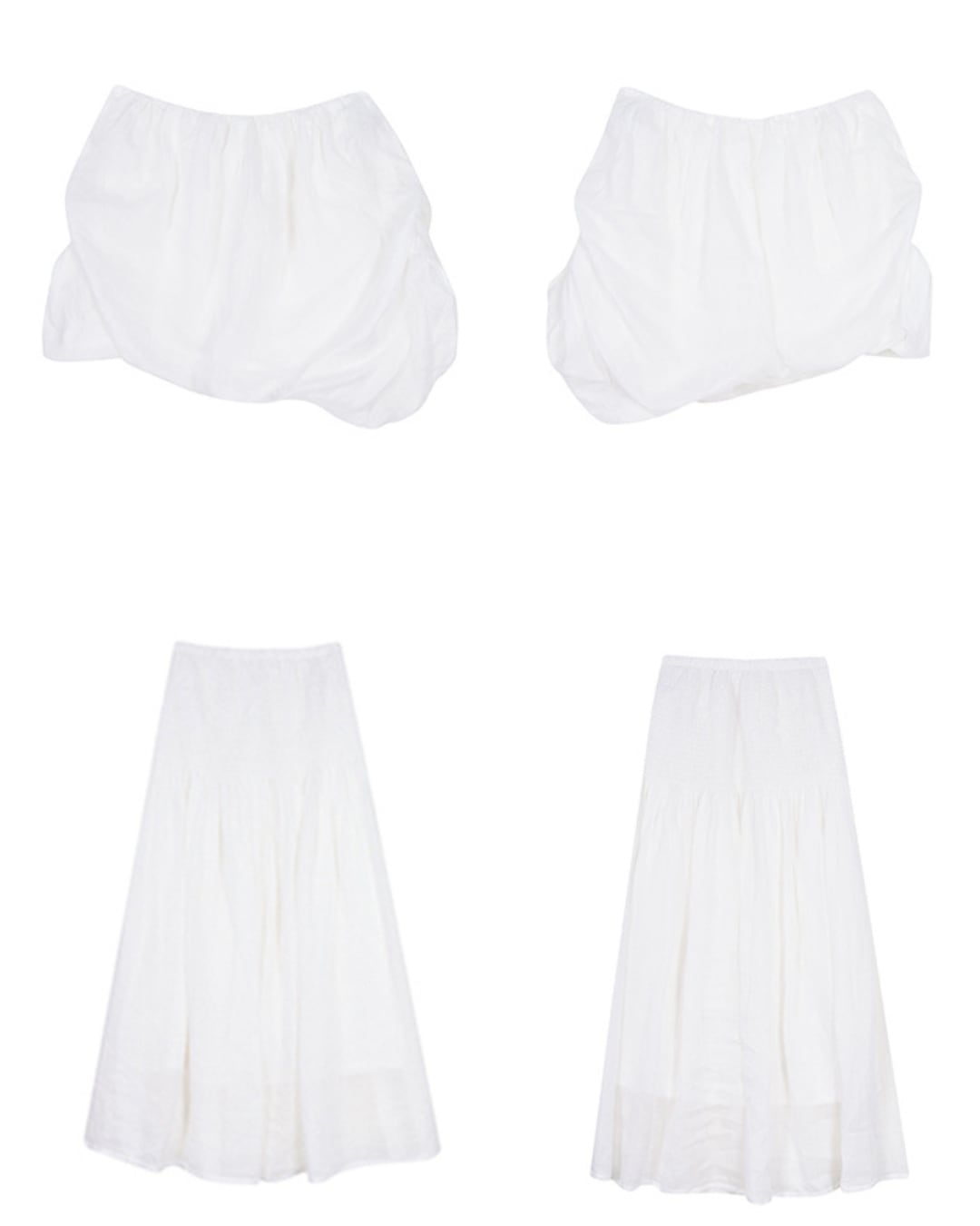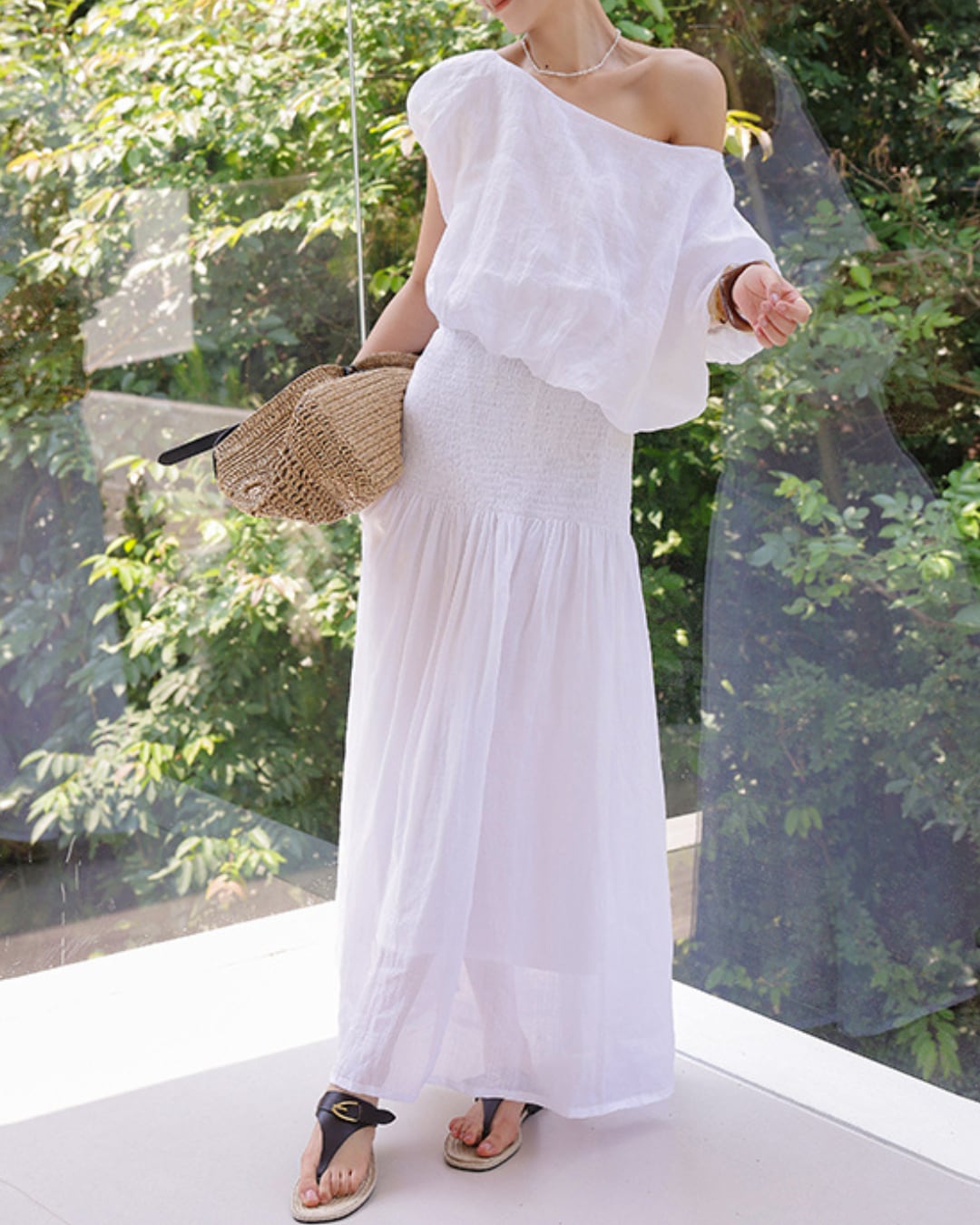 リゾート感あふれるワンショルダーのトップスと、ギャザーたっぷりのフレアスカートが魅力の2点セット。風を含む軽やかなラミー素材が、涼しげで上品な印象を演出。夏のバカンスやタウンユースにもぴったりです。