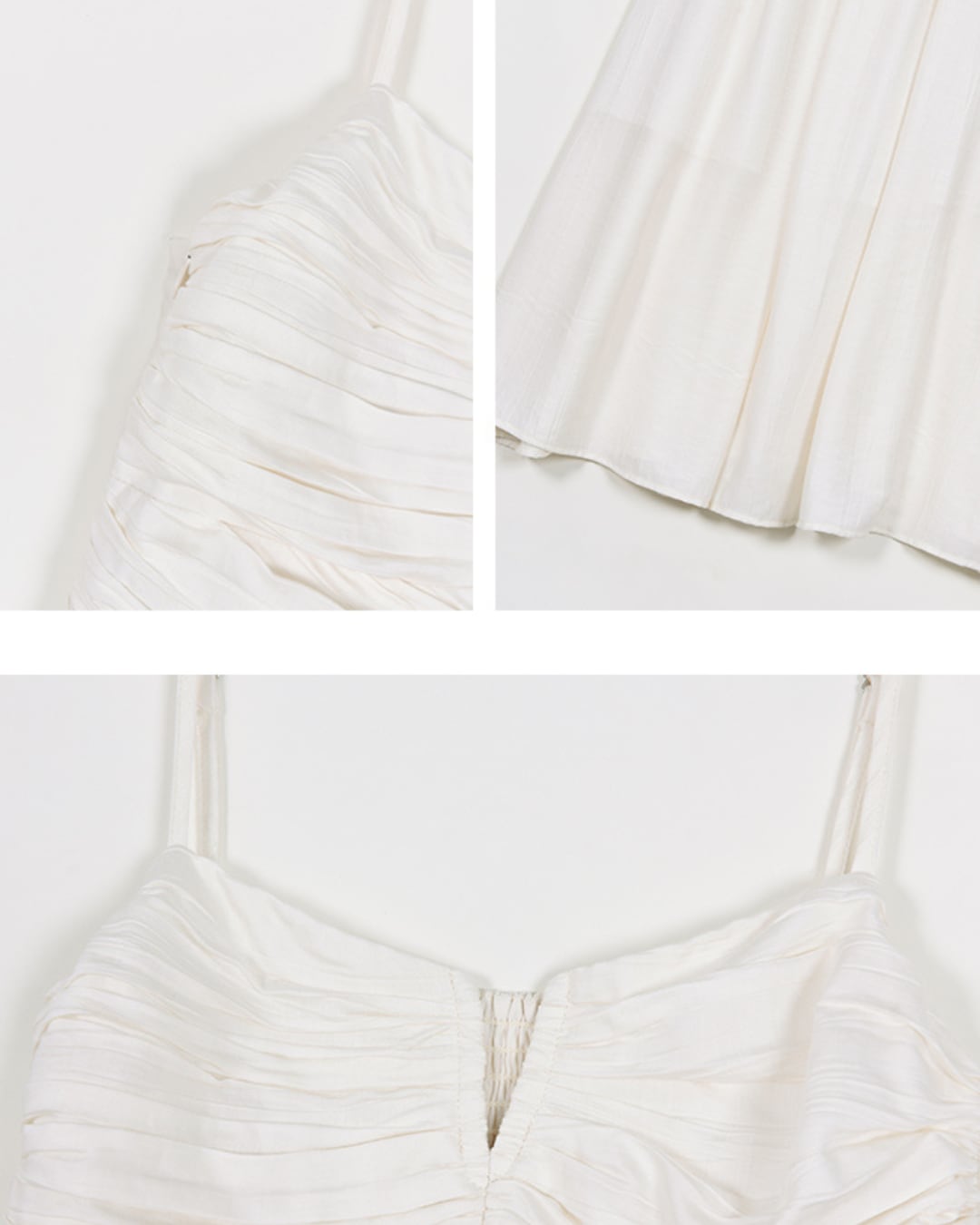 華奢なストラップと美しいシャーリングが魅力のキャミワンピース。胸元のカットデザインがアクセントとなり、夏のリゾートスタイルにもぴったりな一枚。エアリーな素材感で女性らしさが引き立ちます。