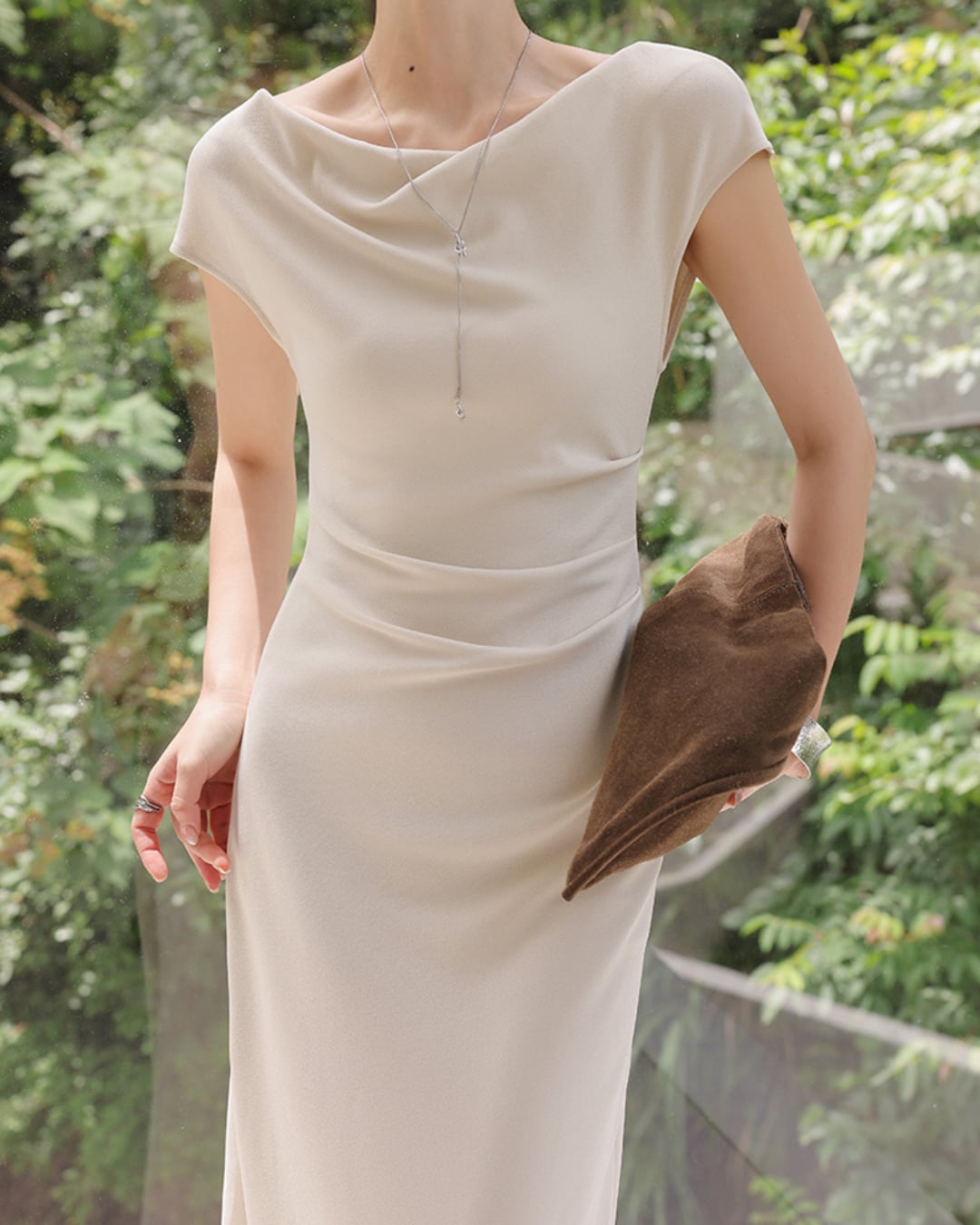 デコルテを美しく見せるオフショルダーのデザインが魅力のロングワンピース。柔らかく落ち感のある生地が、女性らしい優雅なシルエットを演出します。一枚で洗練された印象に仕上がる、夏にぴったりの上品スタイル。