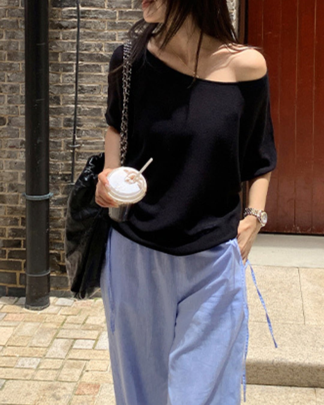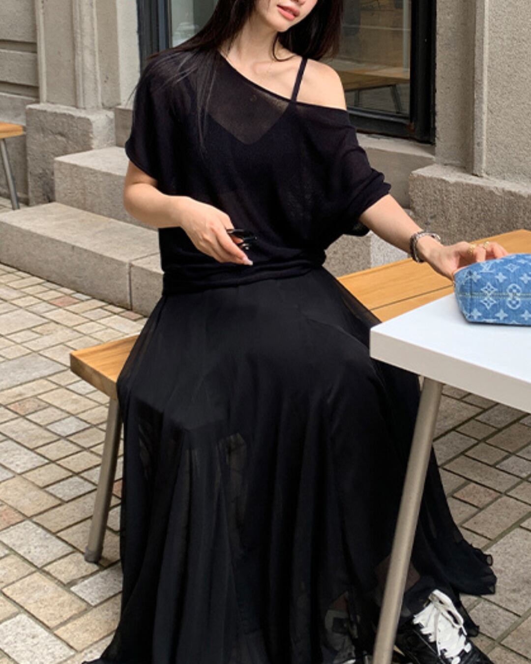 #シアーニット #ルーズトップス #ドロップショルダー #サマーニット #レイヤードコーデ #ブラックトップス