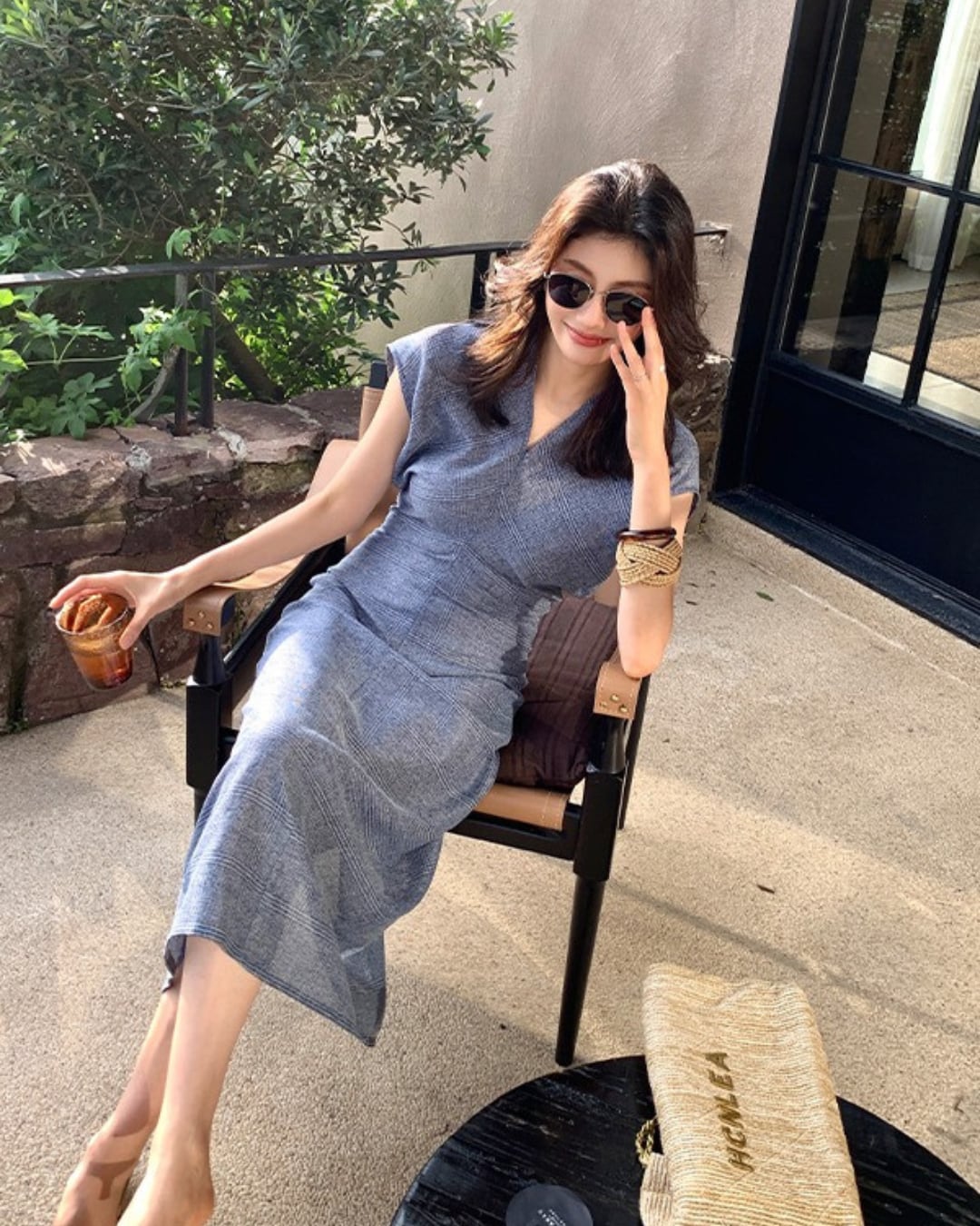 #ヴィンテージブルー #Vネックワンピース #ノースリーブ #ウエストシェイプ #大人上品 #サマースタイル