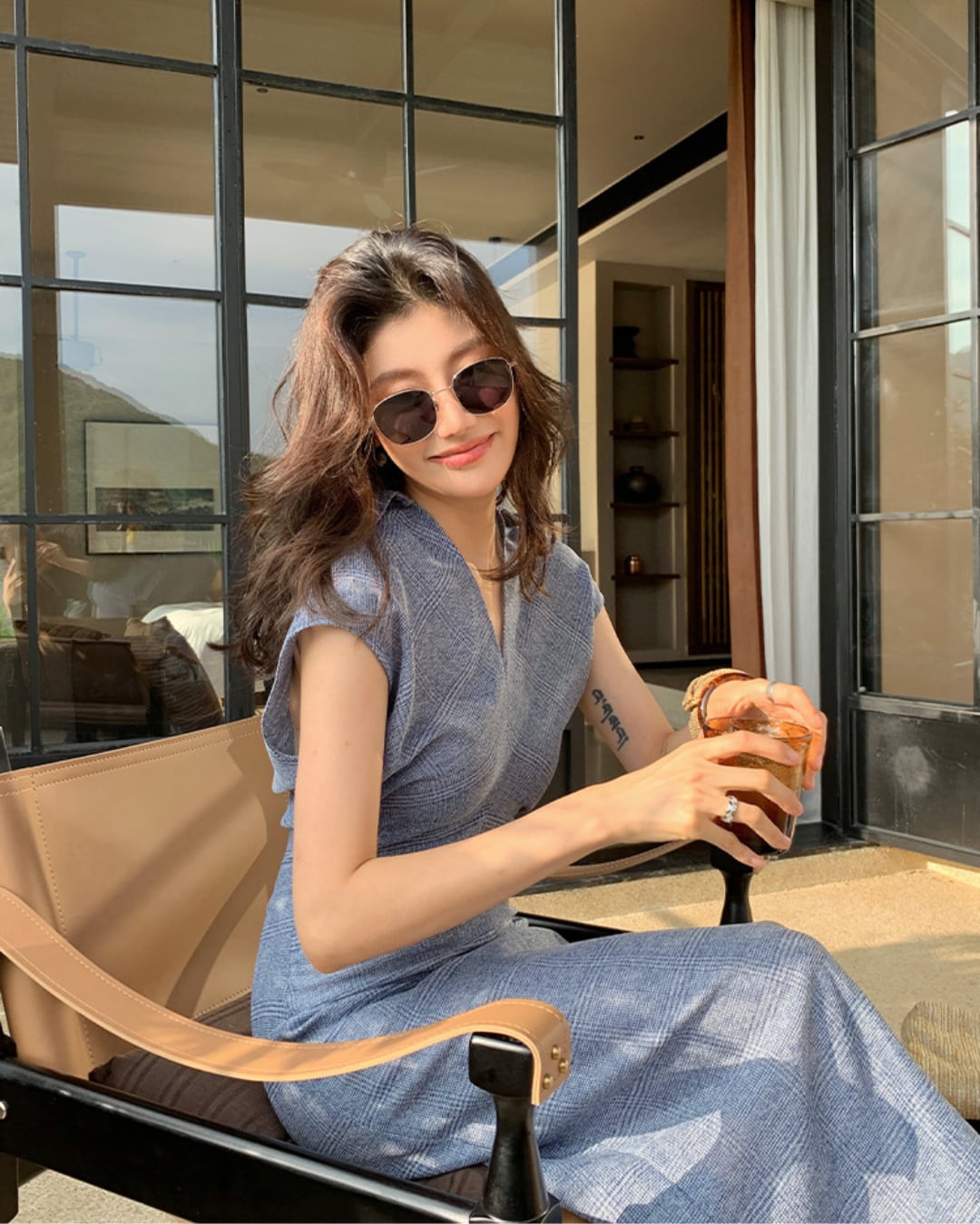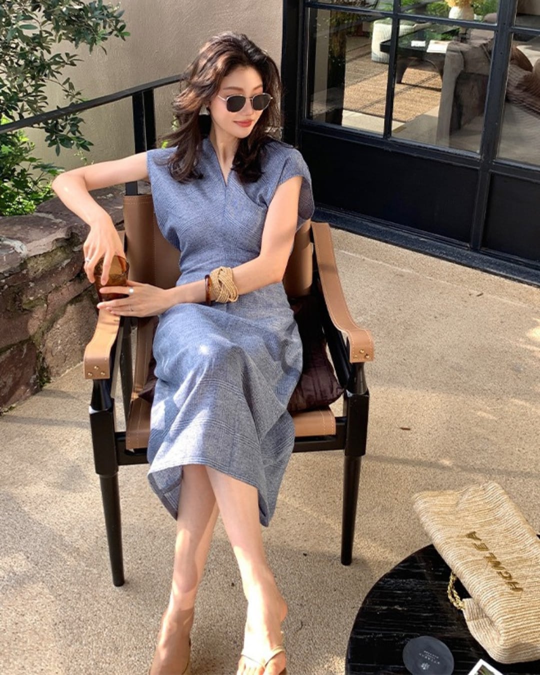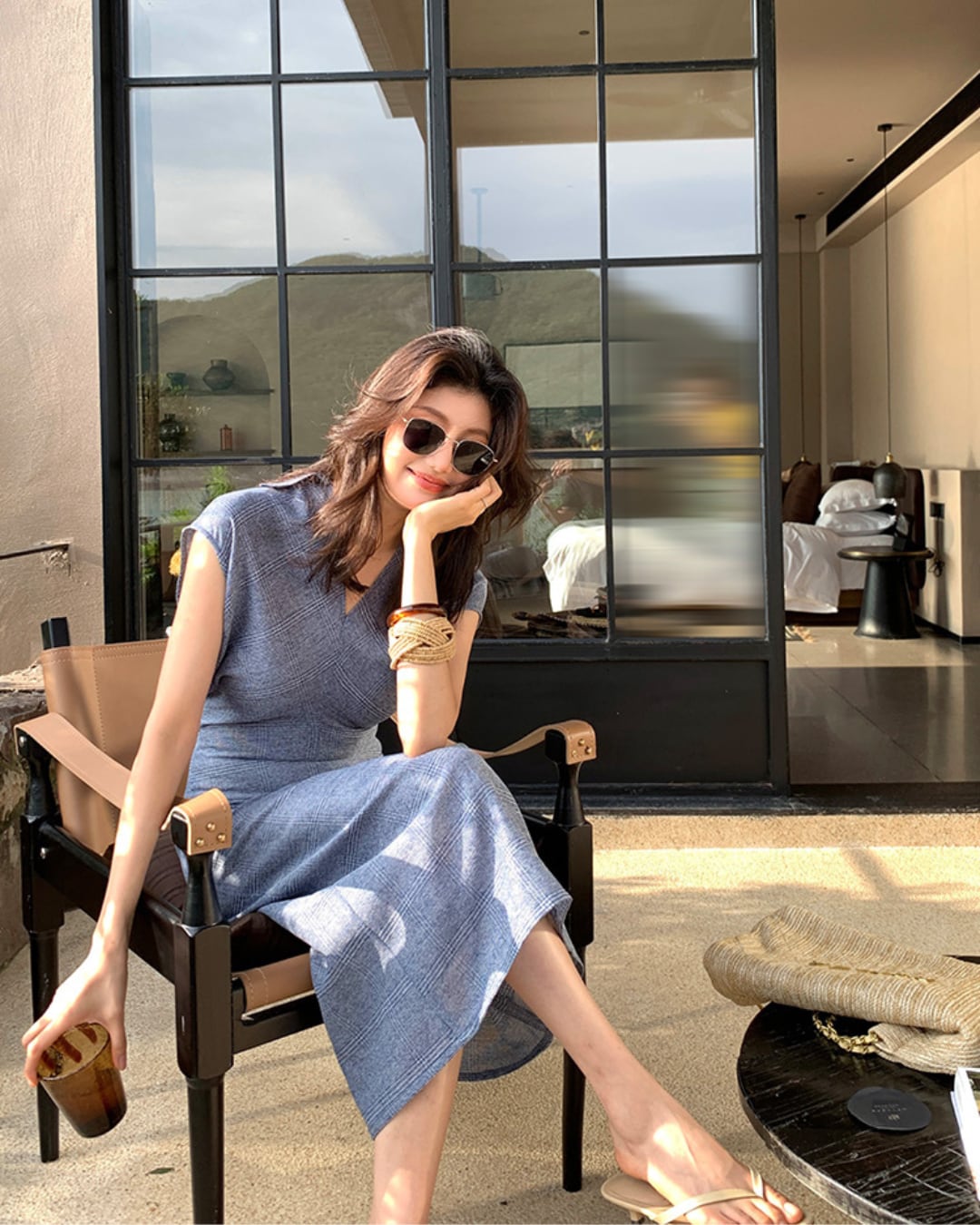 落ち着いたトーンのヴィンテージブルーが印象的な、上品シルエットのノースリーブワンピース。ウエストシェイプとVネックで女性らしさを引き立て、さらりと着るだけで洗練された大人の装いに。お出かけにもリゾートにも映える一枚です。