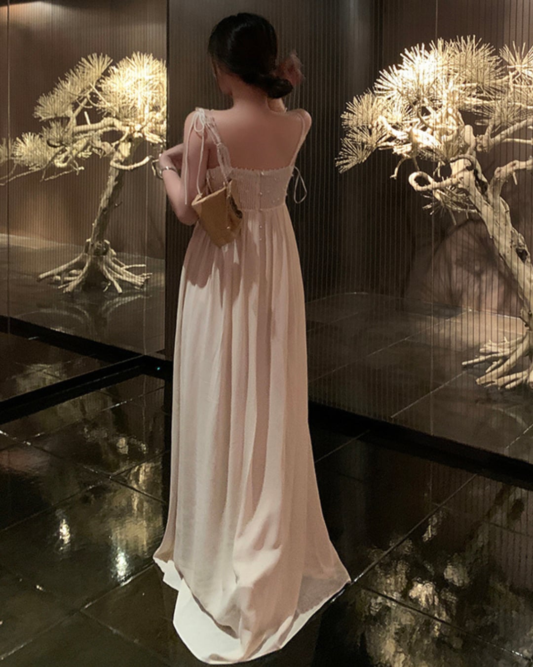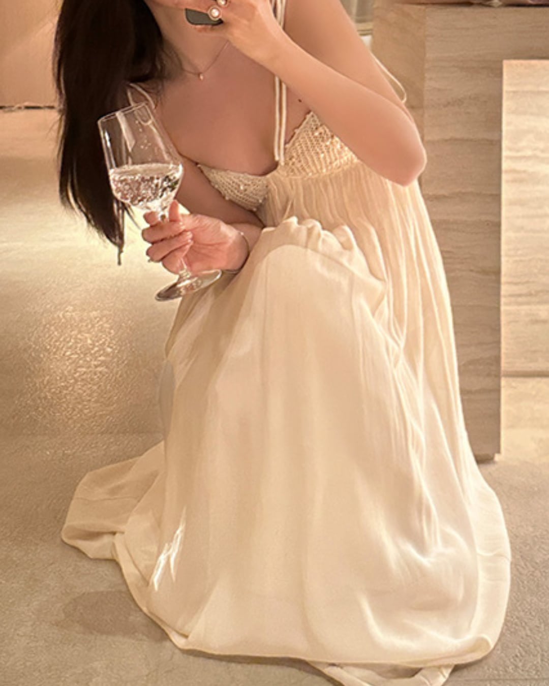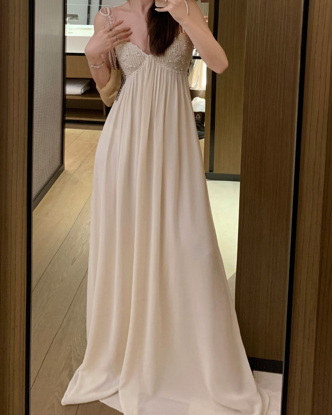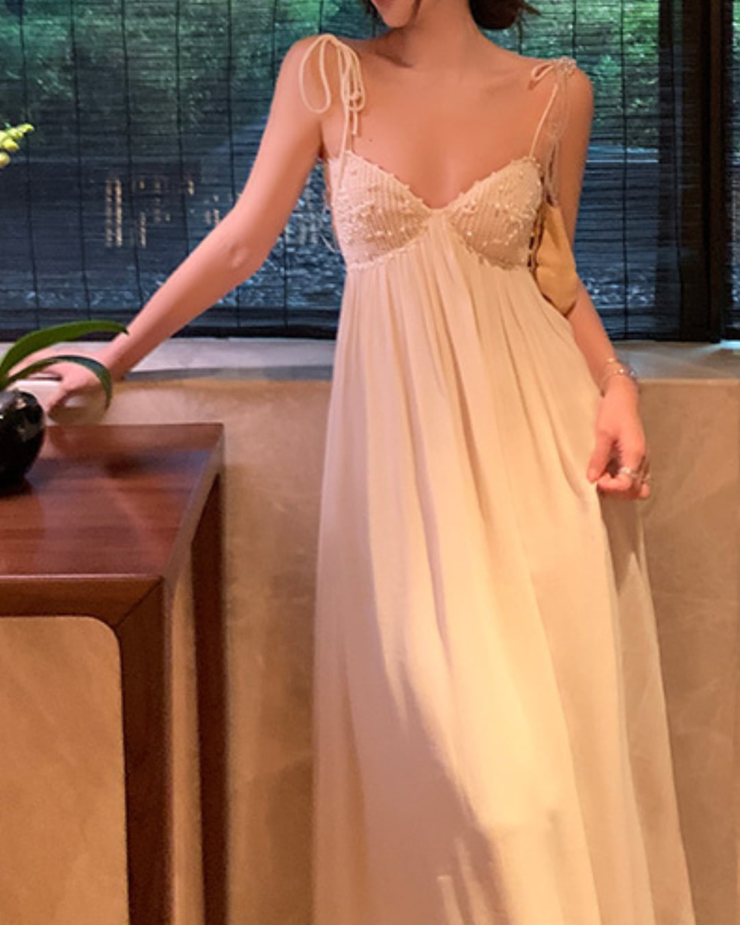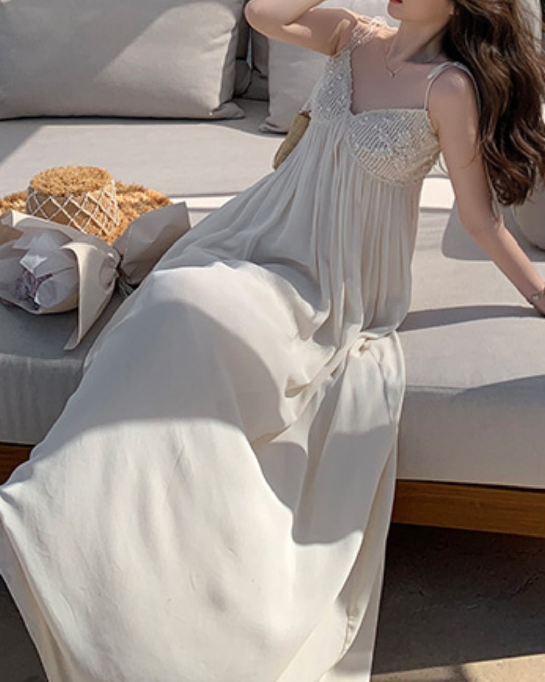 繊細なレースカップが目を惹く、エレガントなロングキャミワンピース。胸元から広がるゆったりとしたAラインシルエットが美しいドレープを生み、上品さと女性らしさを演出します。夏のお出かけやバカンスにもぴったりな一枚。