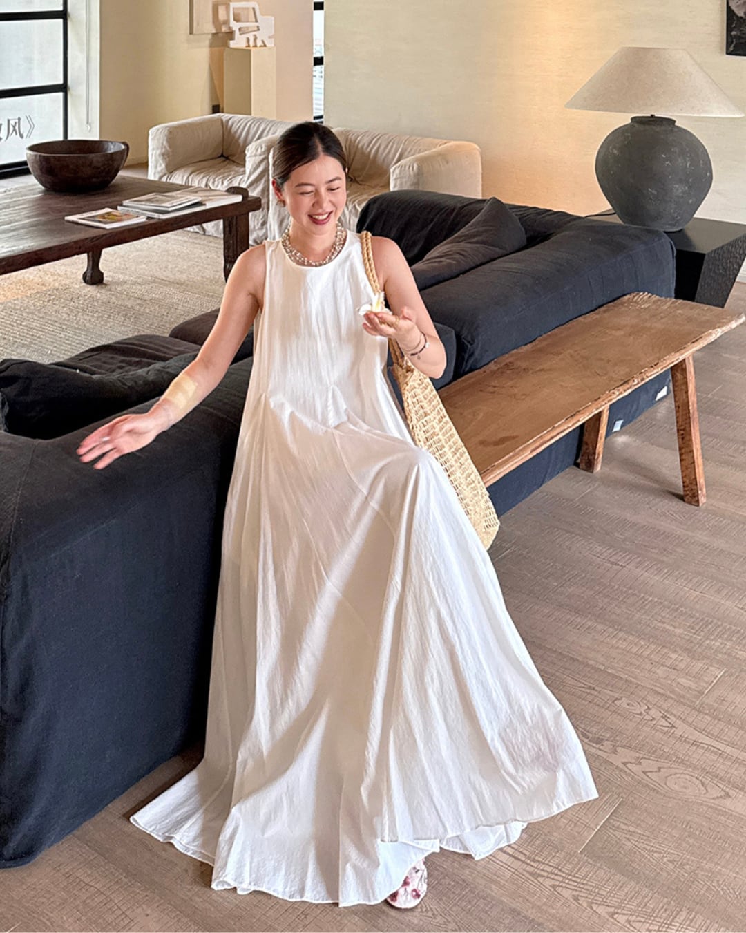 #フレアワンピース #コットンワンピース #ノースリーブ #Aライン #ホワイトコーデ #夏ワンピース #リラックススタイル