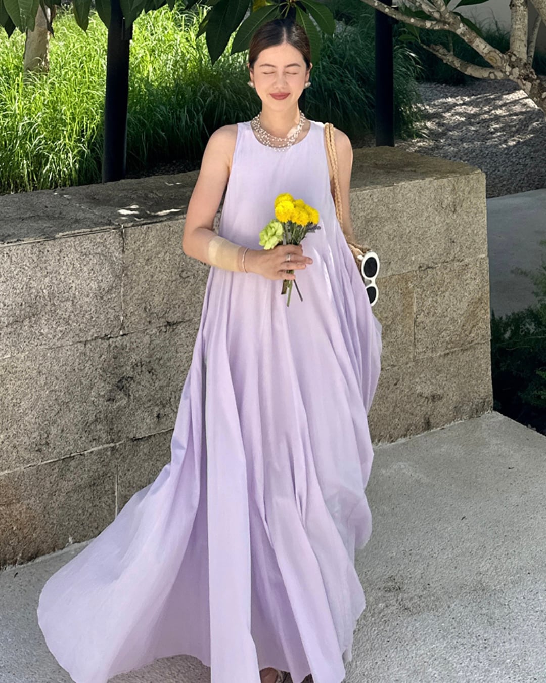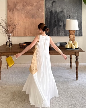 ふんわりと広がるAラインシルエットが美しい、コットン100%のノースリーブワンピース。程よいハリ感があり、動くたびに優雅に揺れる軽やかな生地感が魅力。リラックス感がありながらも上品に決まる一枚です。