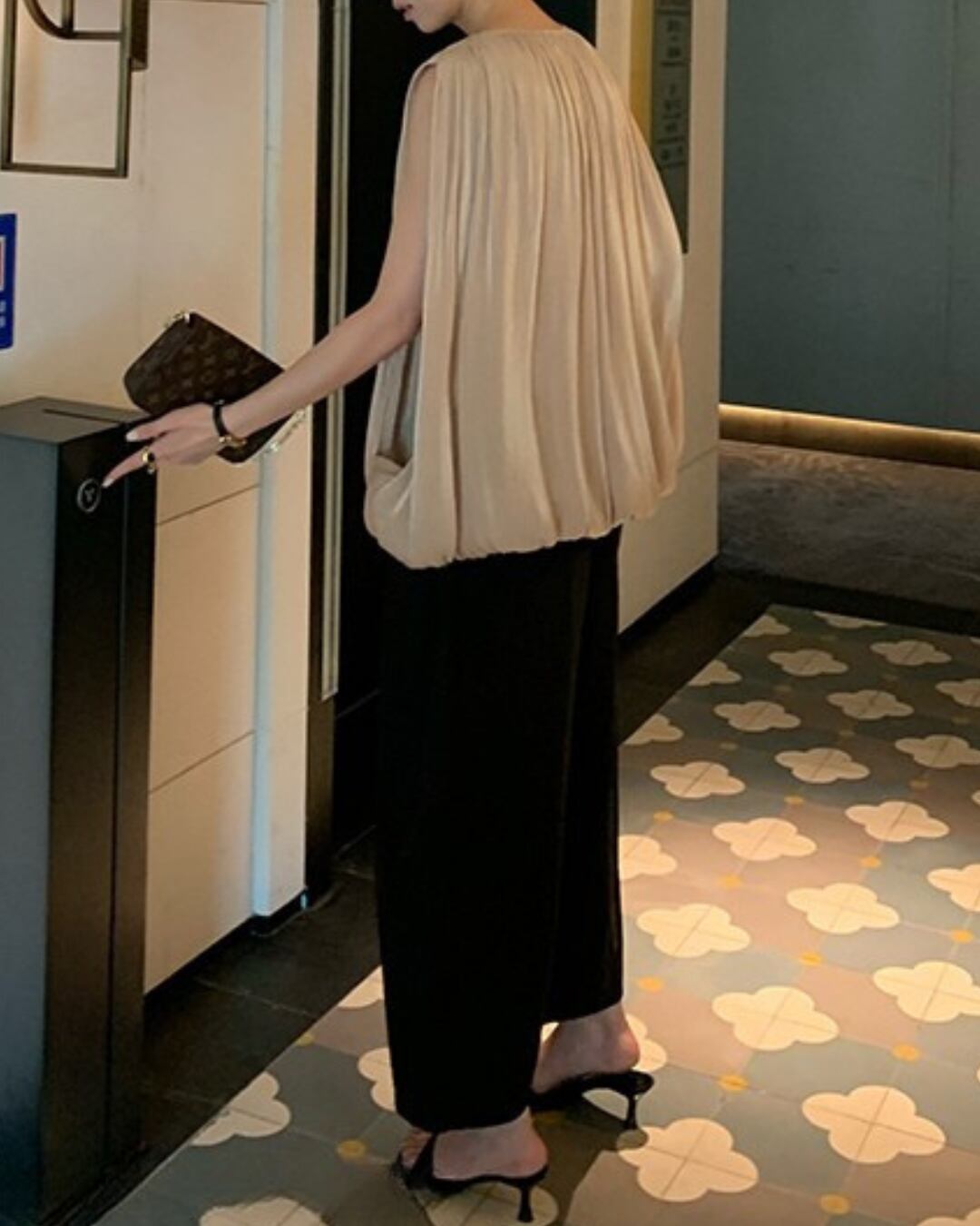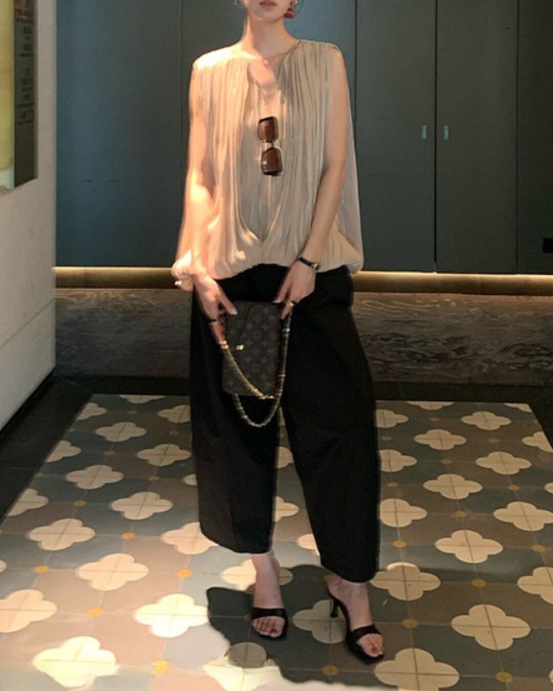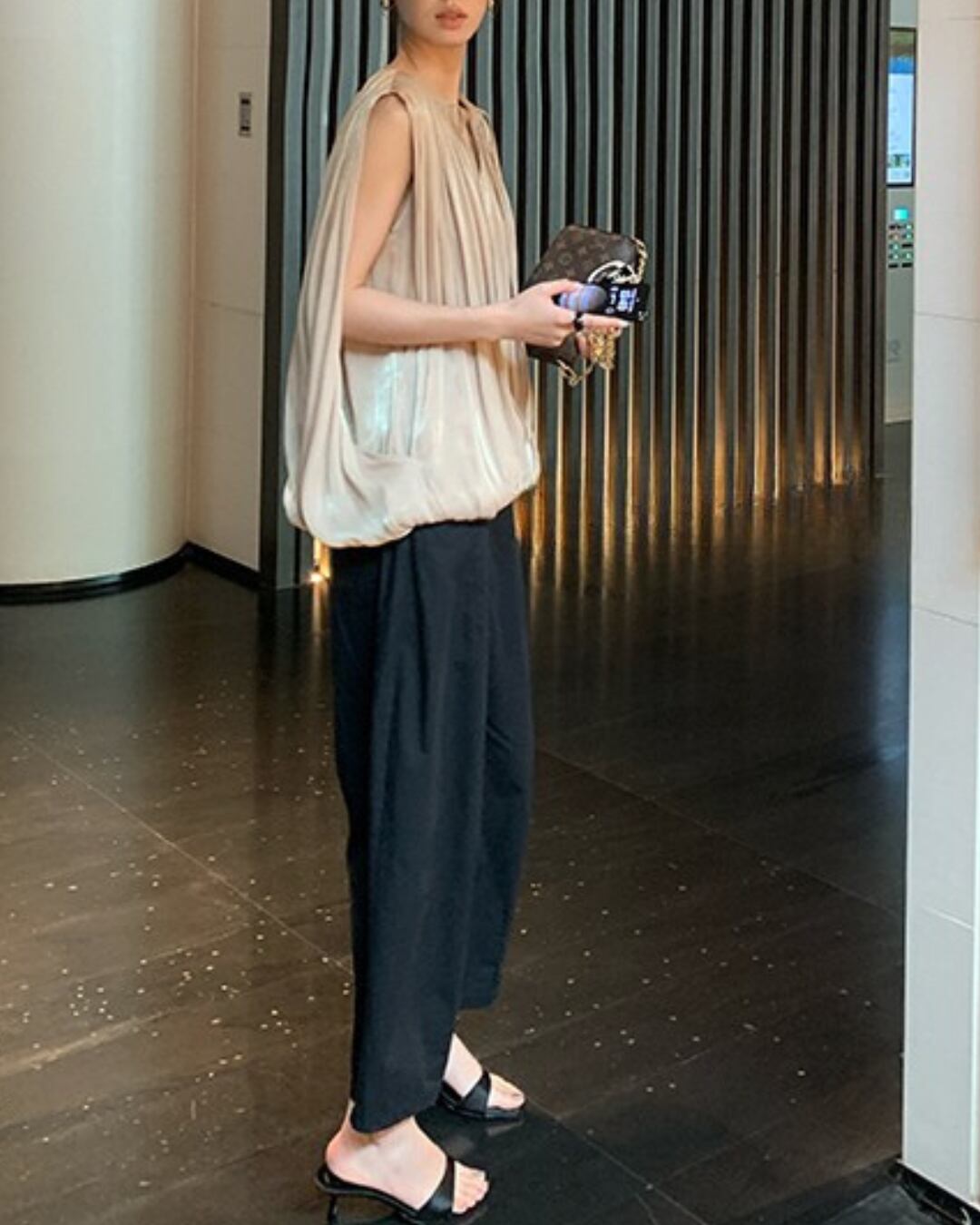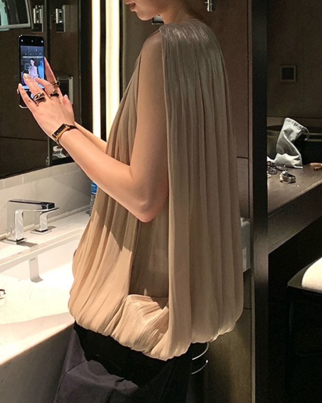 #プリーツ #シャンパンゴールド #Vネック #ノースリーブ #立体シルエット #ラグジュアリーコーデ