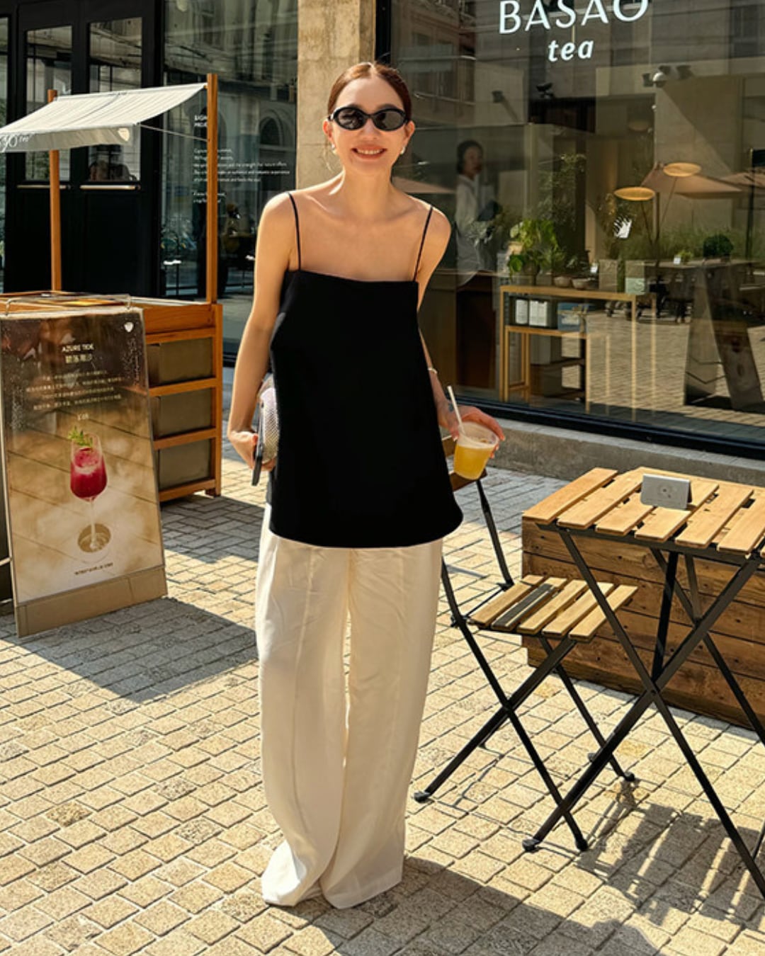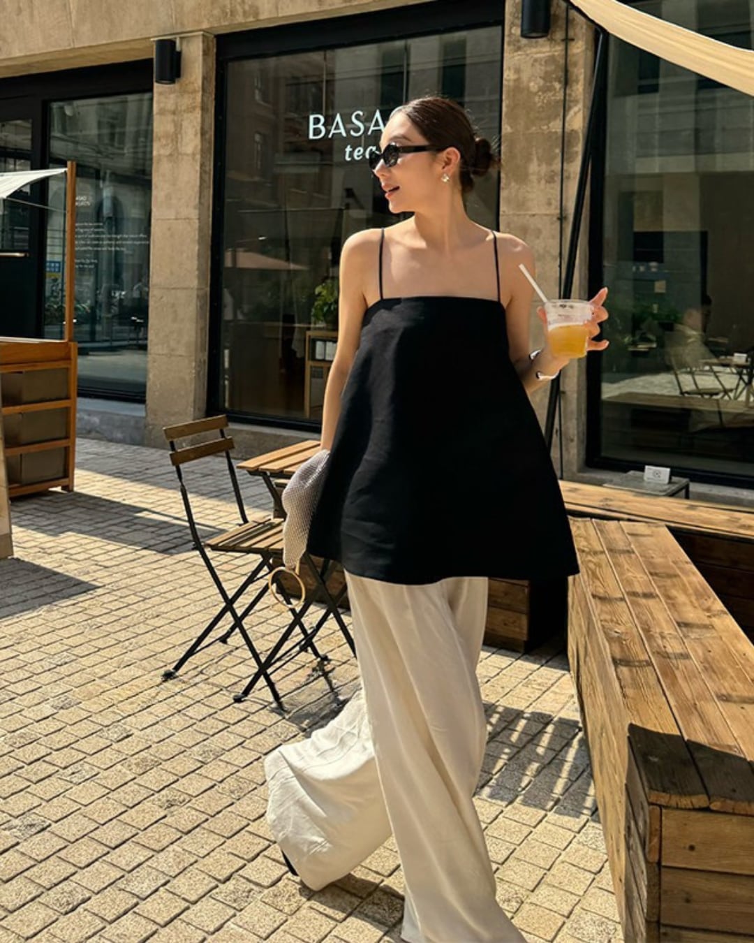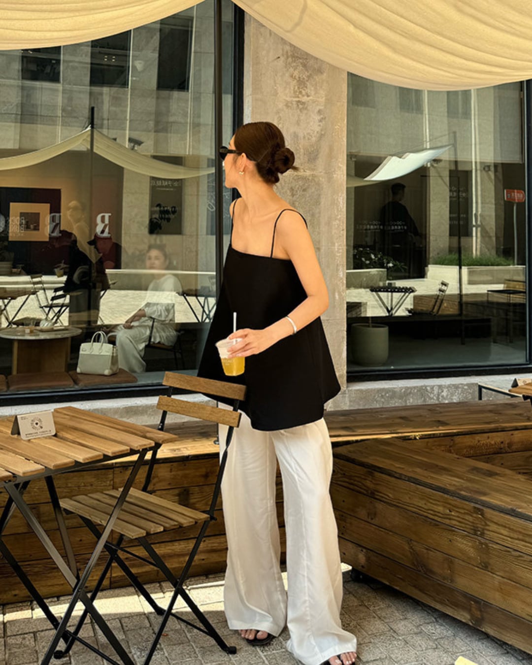 ミニマルで洗練された雰囲気が魅力のブラックキャミトップ。軽やかな薄手素材で、ふんわりと広がるシルエットが大人の余裕を演出。シンプルながらも存在感のある一枚で、パンツにもスカートにも好相性。スタイリッシュな夏コーデにぴったりなアイテムです。