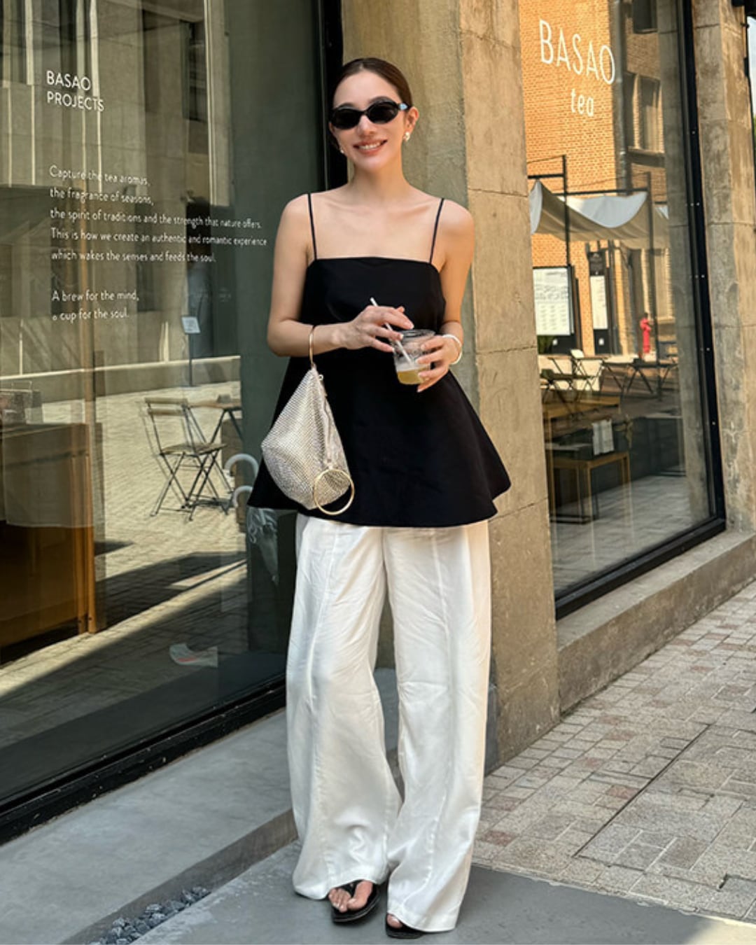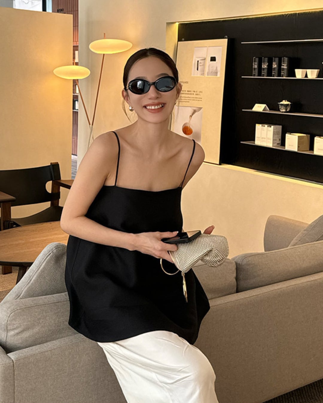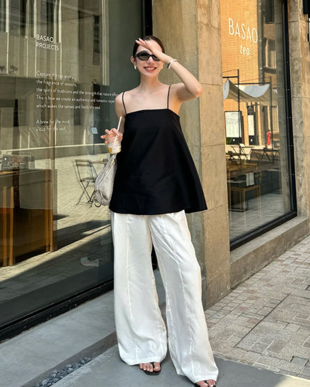 ミニマルで洗練された雰囲気が魅力のブラックキャミトップ。軽やかな薄手素材で、ふんわりと広がるシルエットが大人の余裕を演出。シンプルながらも存在感のある一枚で、パンツにもスカートにも好相性。スタイリッシュな夏コーデにぴったりなアイテムです。