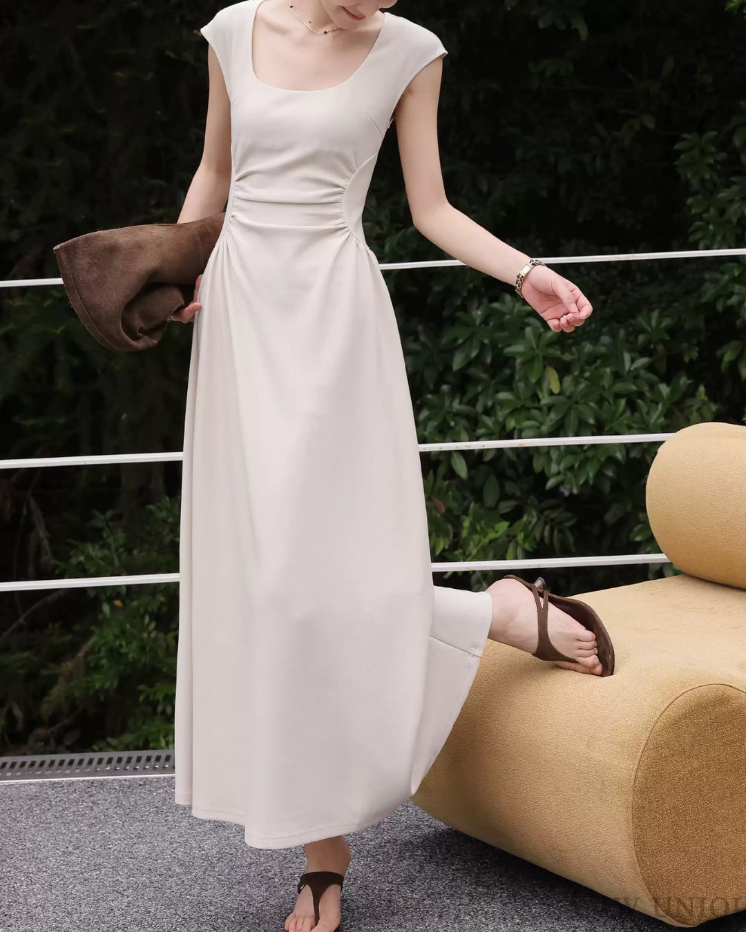 デコルテを美しく見せるスクエアネックと、ウエストのタックが魅力のマキシ丈ワンピース。滑らかな落ち感としなやかな生地が女性らしいシルエットを引き立て、シンプルながらも洗練された印象に仕上がります。