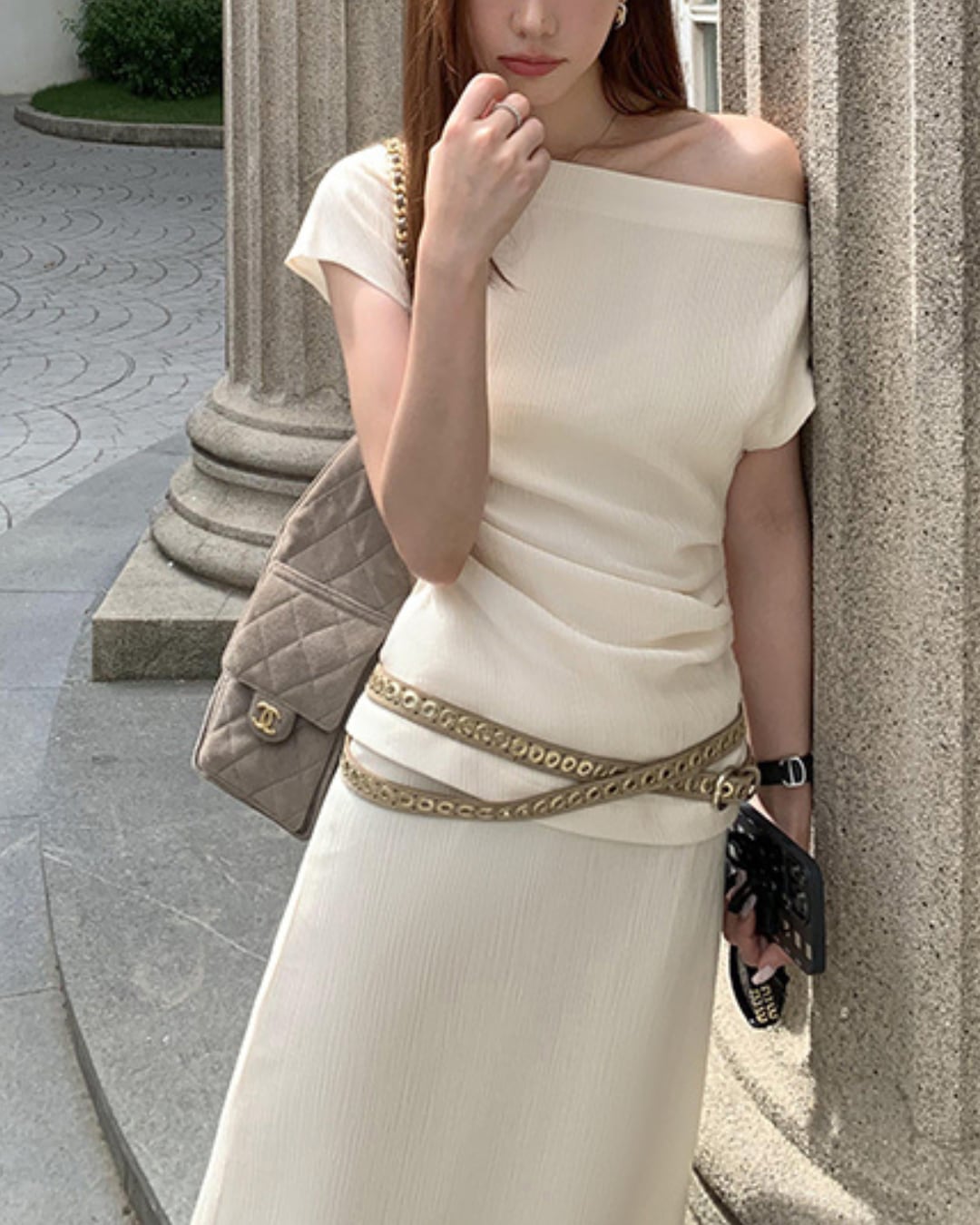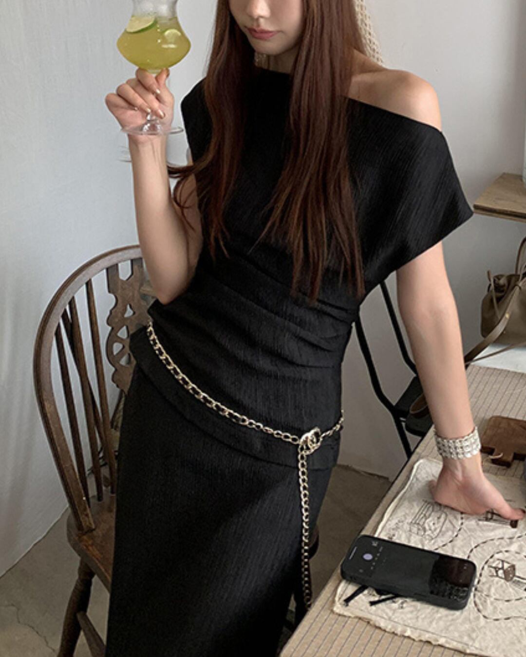 #セットアップ #アシンメトリーショルダー #ギャザートップス #美シルエット #韓国ファッション #2色展開