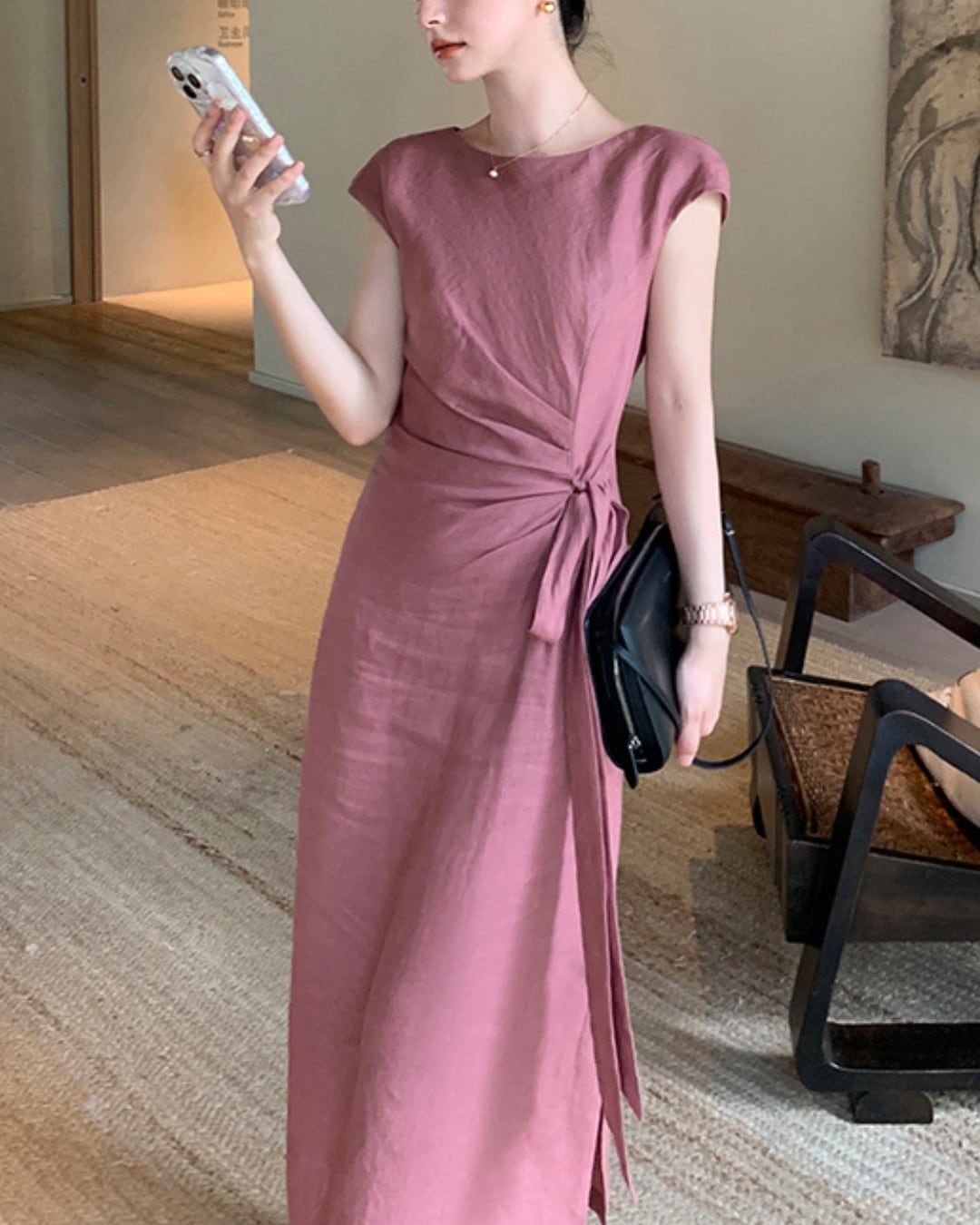ナチュラルな風合いのリネン素材を使用した、クラシックな雰囲気漂うワンピース。シンプルながら女性らしいシルエットを引き立てるデザインで、涼しく快適に過ごせます。
