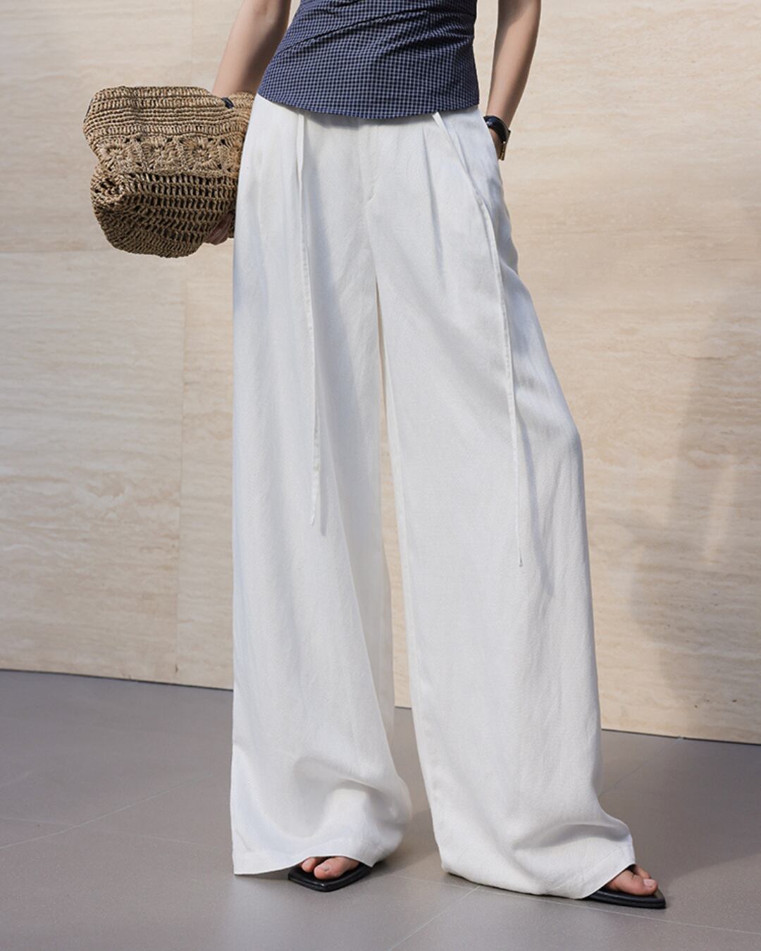 さらりとした肌触りの薄手リネンブレンド素材を使用した、ハイウエストのワイドシルエットパンツ。リラックス感のある穿き心地ながらも、タック入りで美しい落ち感を演出。ナチュラルな米白カラーで、涼しげでこなれた印象に。