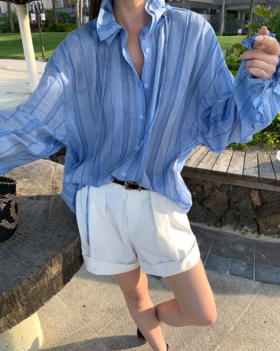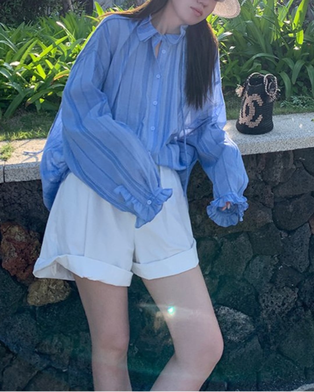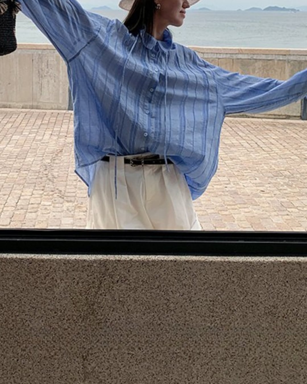 清涼感たっぷりのストライプシャツ。ドロップショルダー&ボリューム袖で、ラフに羽織るだけで抜け感のある大人スタイルが完成。ゆったりとしたオーバーサイズ感で、日差しよけや冷房対策にもぴったり◎軽やかな素材と爽やかなブルーの色合いで、リゾートや海辺のお出かけにもおすすめです。