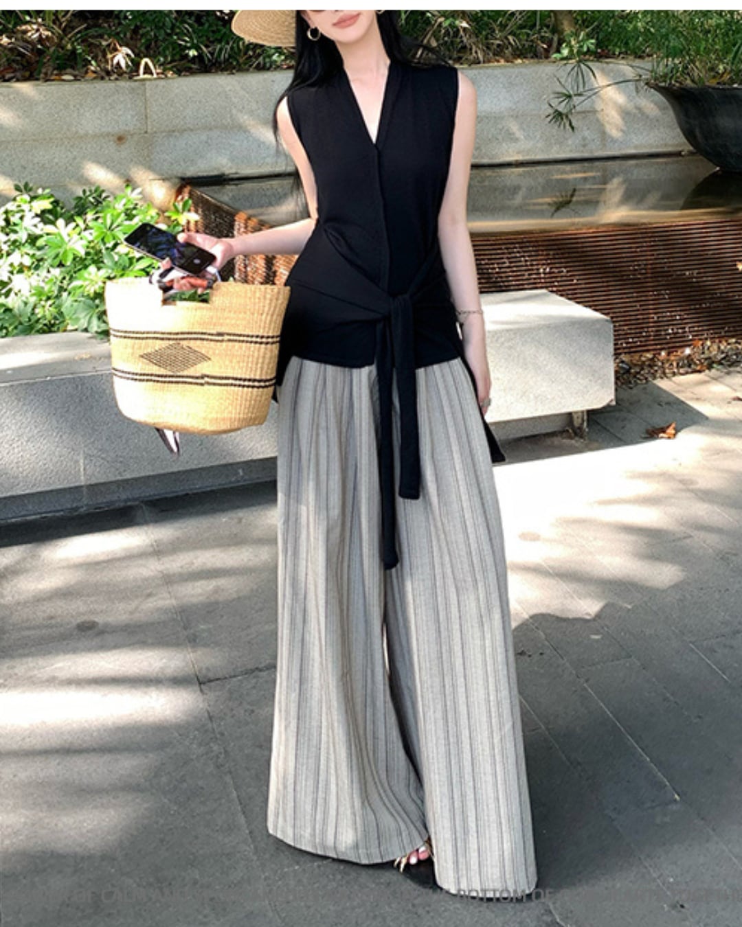 軽やかで肌触りの良いストライプ素材を使用したワイドパンツ。ゆったりとしたシルエットで体のラインを拾わず、リラクシーな雰囲気に。ハイウエスト&センターラインで脚長効果も抜群です。動くたびに揺れる上品なドレープが、大人のリゾートスタイルを演出します。トップスをインすればすっきり見え、セットアップ風コーデもおすすめ。