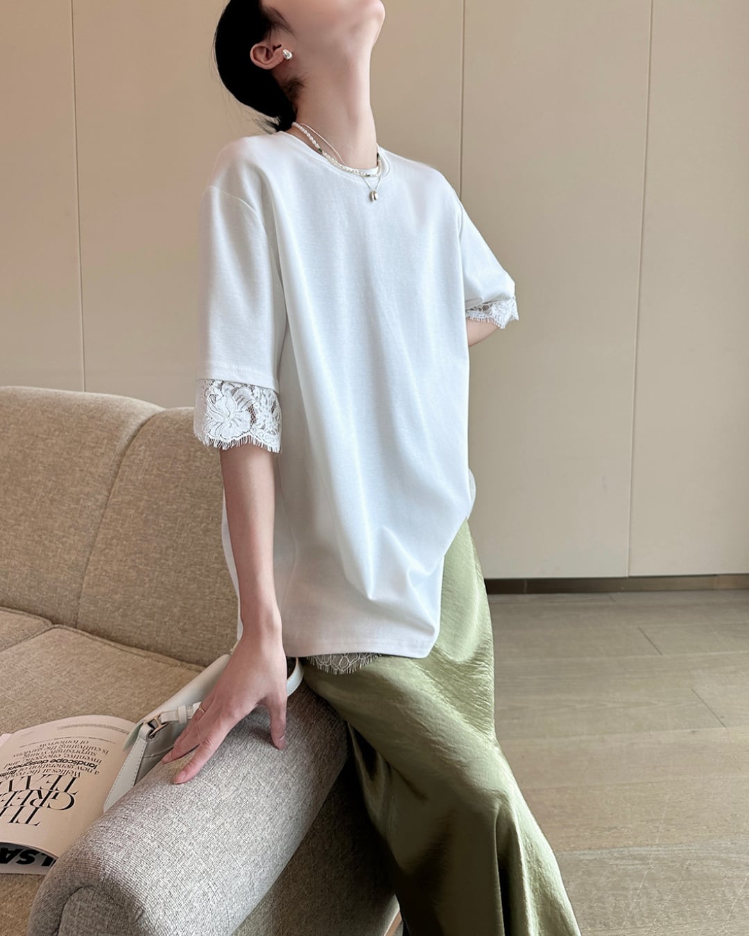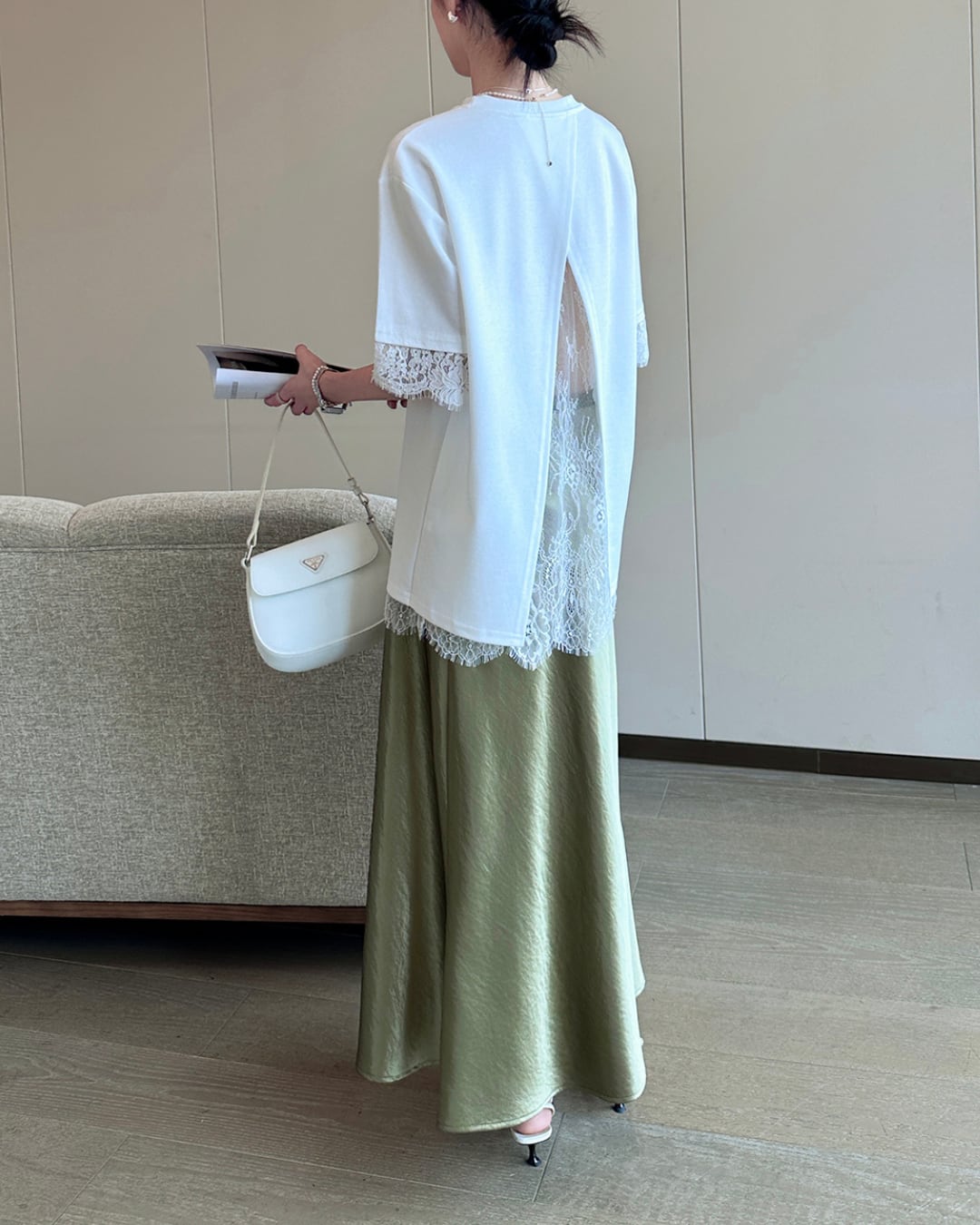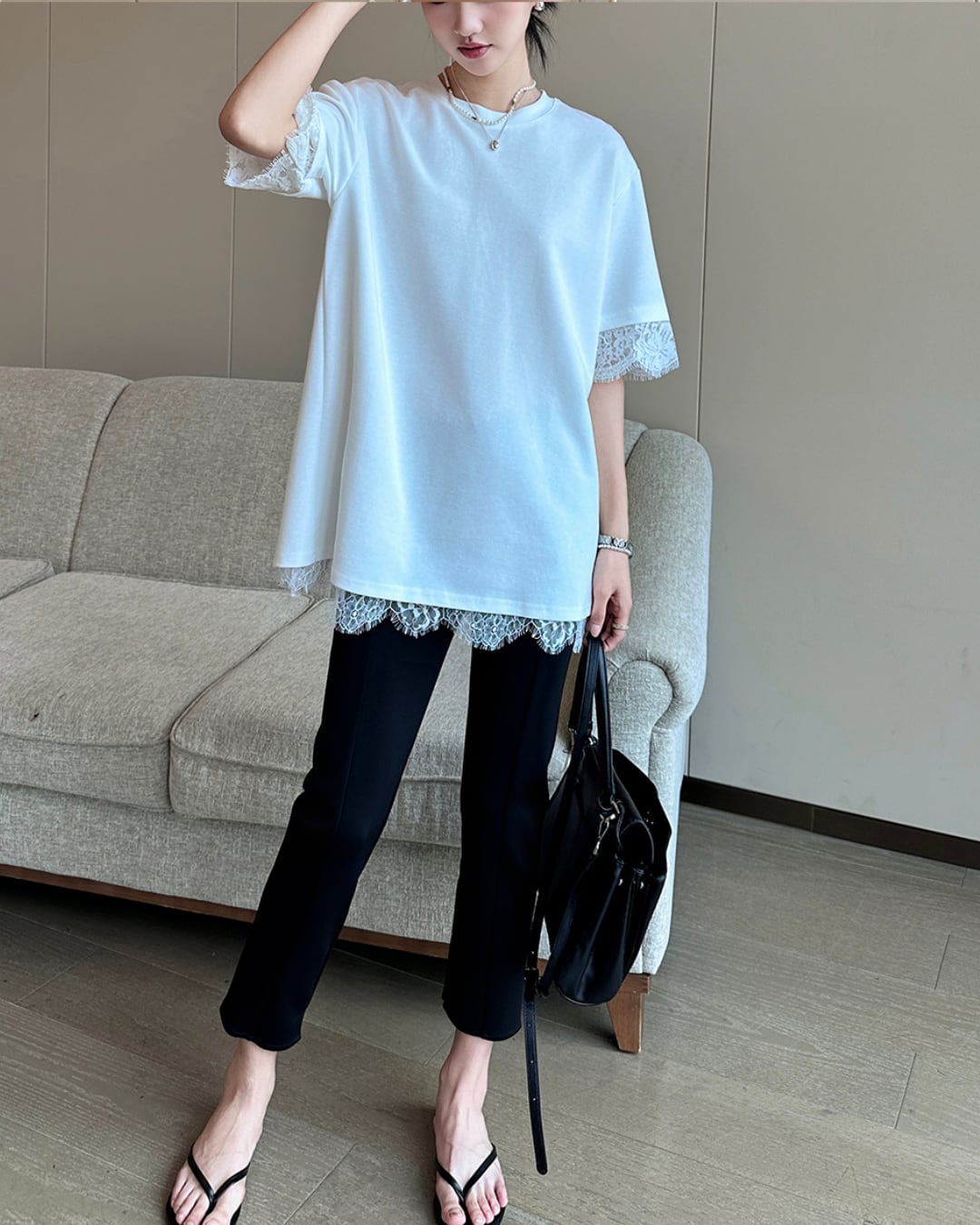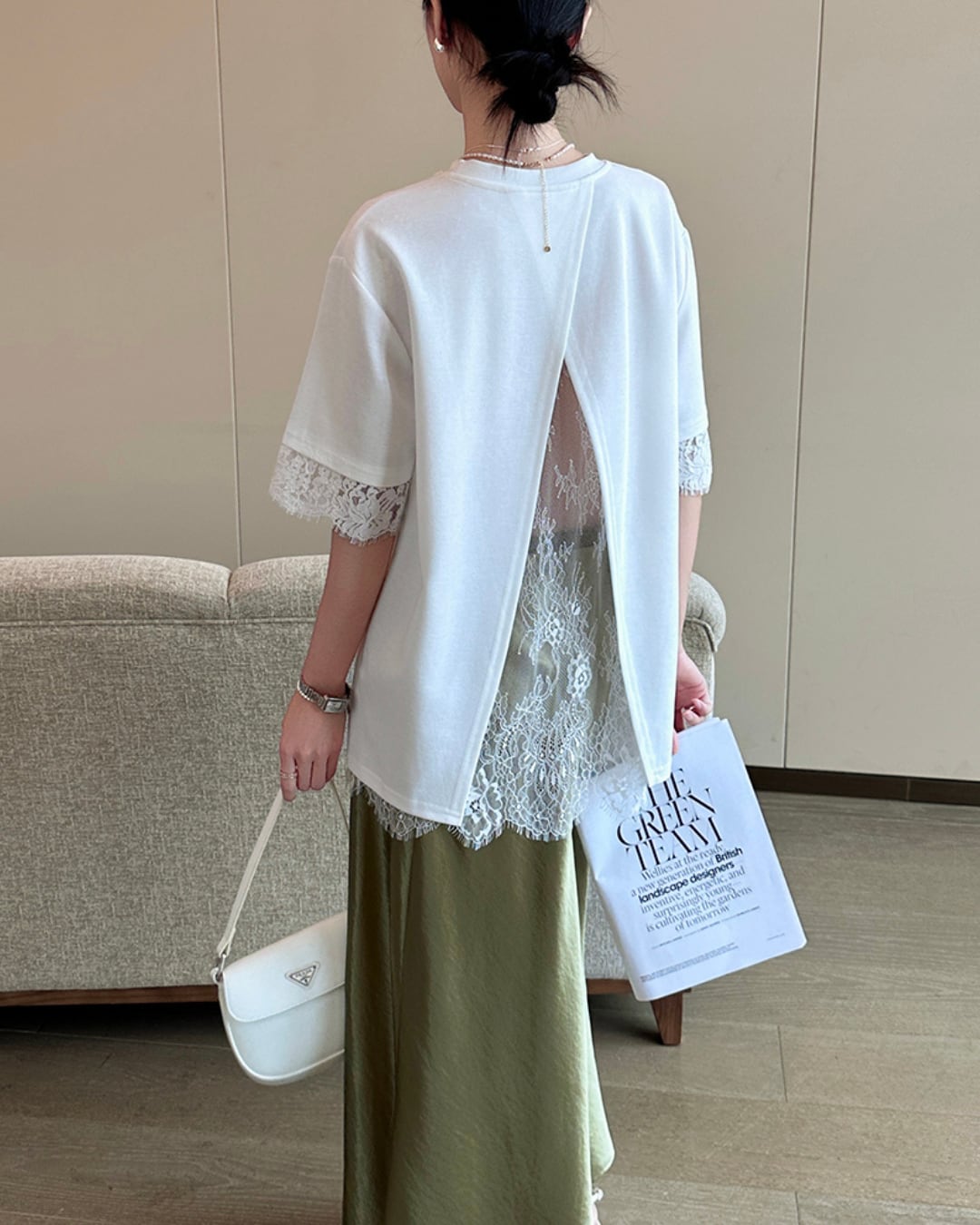 シンプルな中に華やかさを秘めたデザインTシャツ。袖口と裾から覗く繊細なレースがフェミニンな印象をプラスし、バックスタイルには大胆なスリットで抜け感を演出。インナーにレースのカットソーをレイヤードしたような仕様で、1枚で完成されたスタイリングが叶います。程よくゆとりのあるシルエットで着心地も抜群。デニムやスカートなど、幅広いアイテムと好相性です。