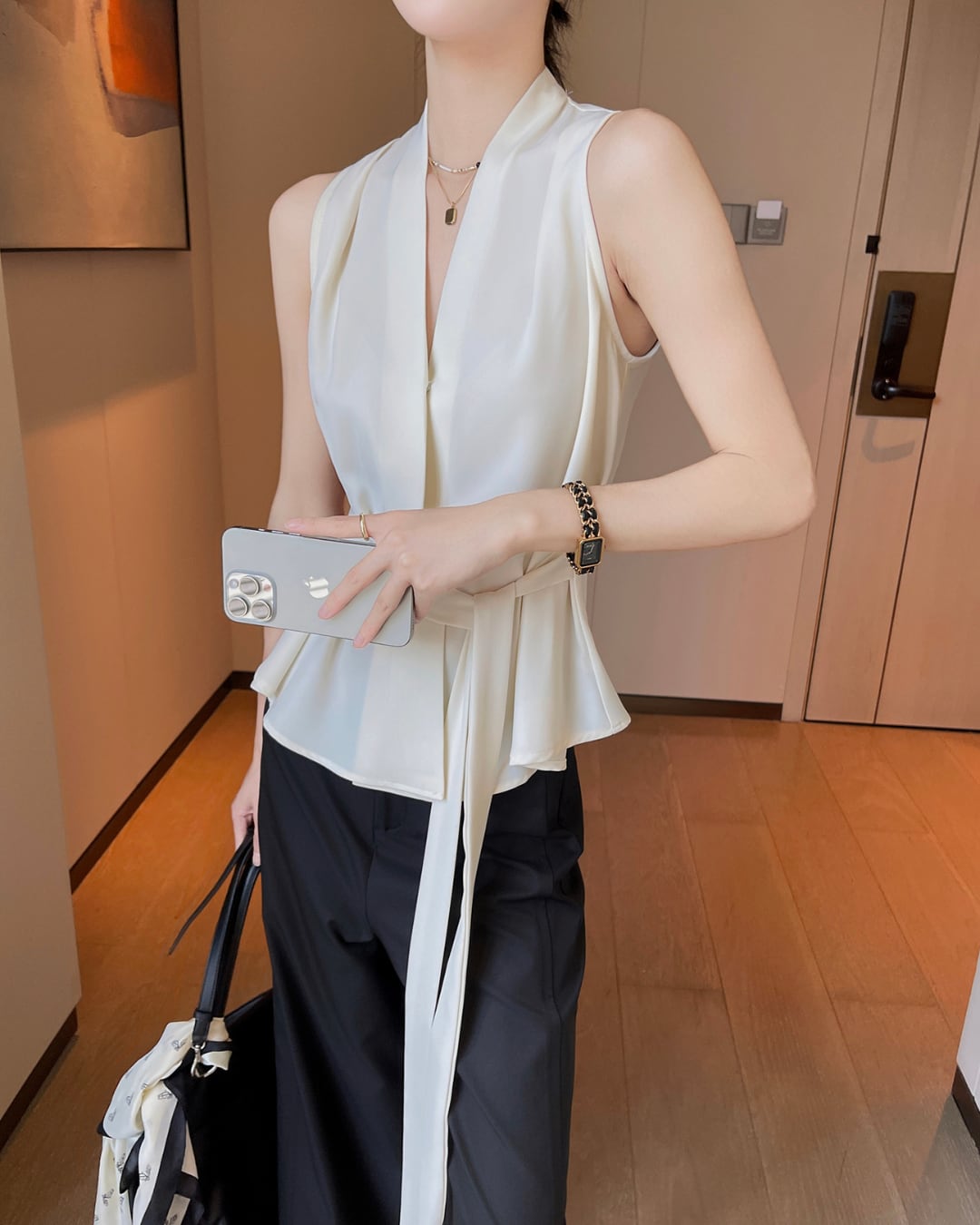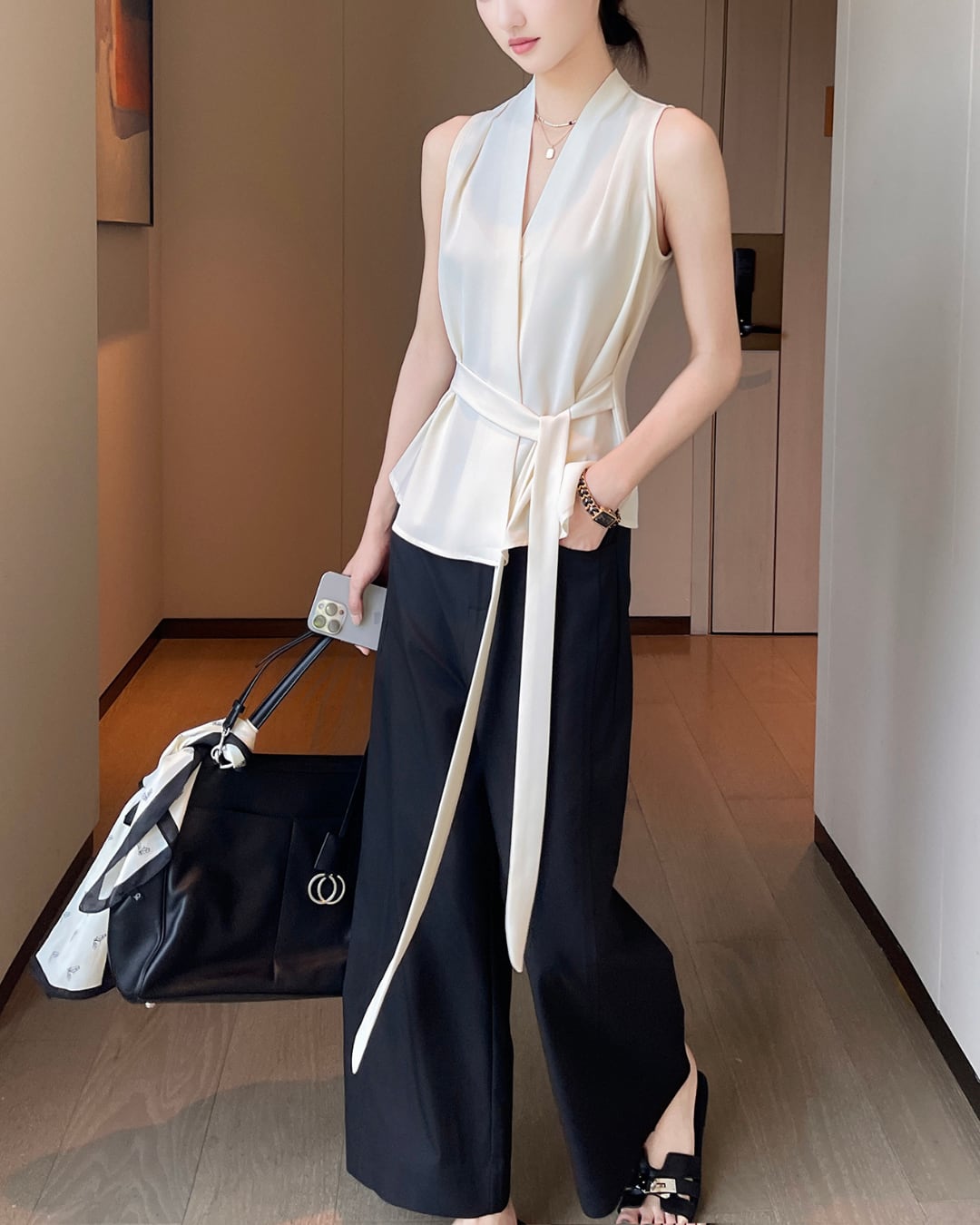 #ノースリーブ #ベルト付き #上品シルエット #ウエストマーク #アイボリートップス #オフィスカジュアル