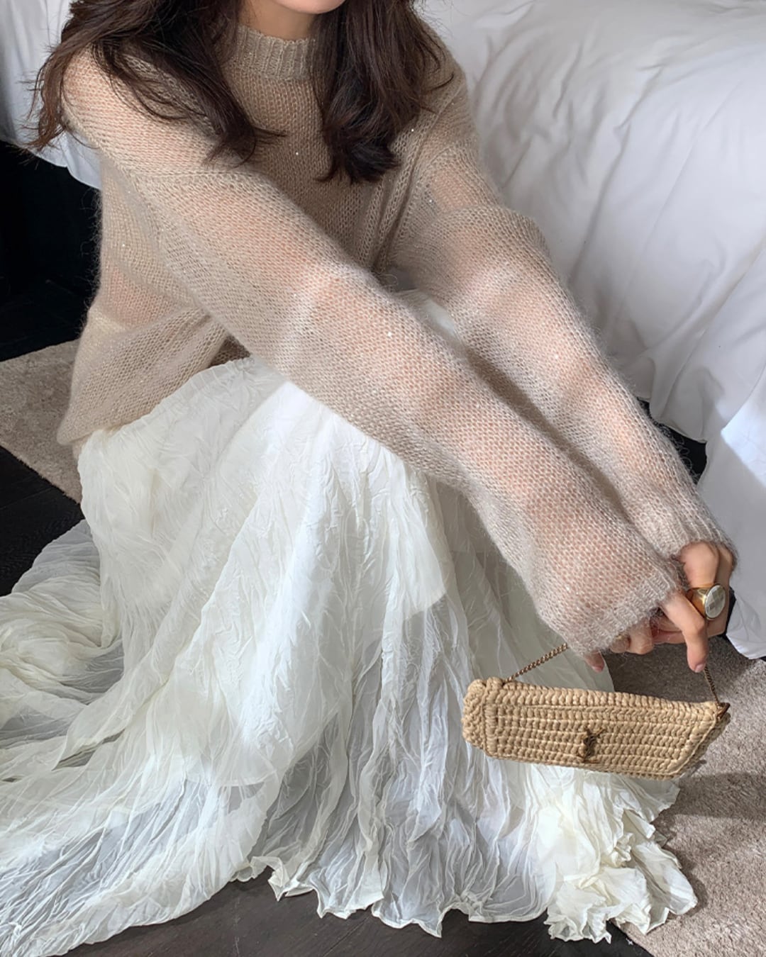 雲のように軽やかでふんわりと広がるプリーツロングスカート。シフォン素材の繊細なシワ加工と、透け感のある裾が動くたびに表情を生み出し、女性らしさを引き立てます。ナチュラルなベージュカラーは、シンプルなトップスと合わせるだけで上品なスタイルが完成。ウエストゴム仕様で履き心地も快適。デイリーにもお出かけにも活躍する万能スカートです。