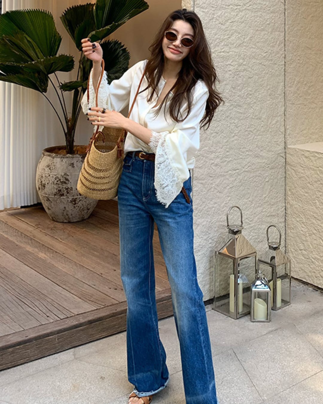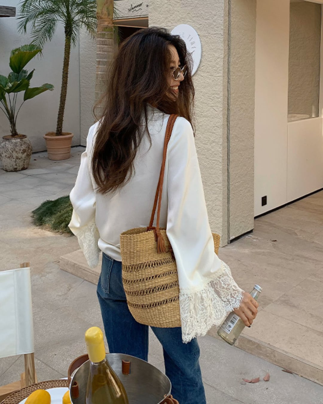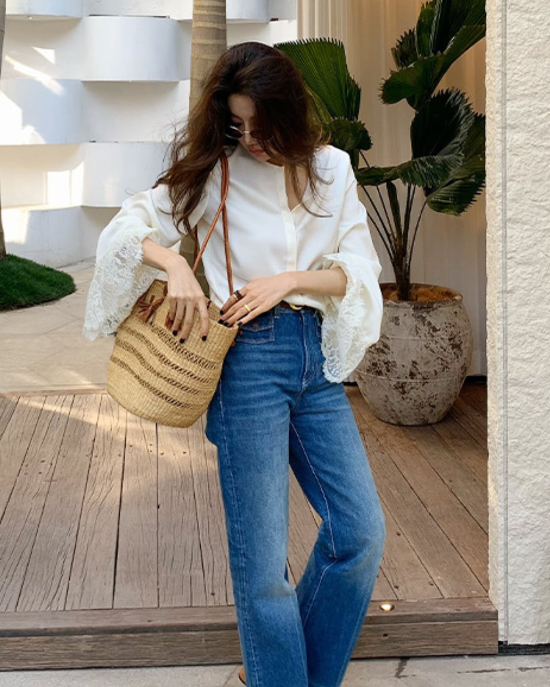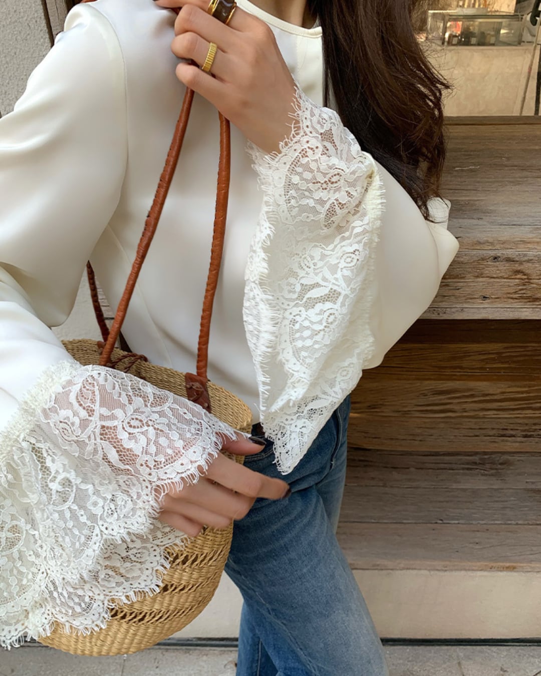 滑らかでとろみ感のあるヴィンテージライクな素材に、フラワーレースを贅沢にあしらったロマンティックな一枚。袖口のフレアラインとレース切り替えがエレガントな印象を与え、着るだけで女性らしいムードが漂います。デニムと合わせてカジュアルダウンも、スカートでキレイめにも着こなせる万能ブラウスです。軽やかな素材感で季節の変わり目にも重宝するアイテム。