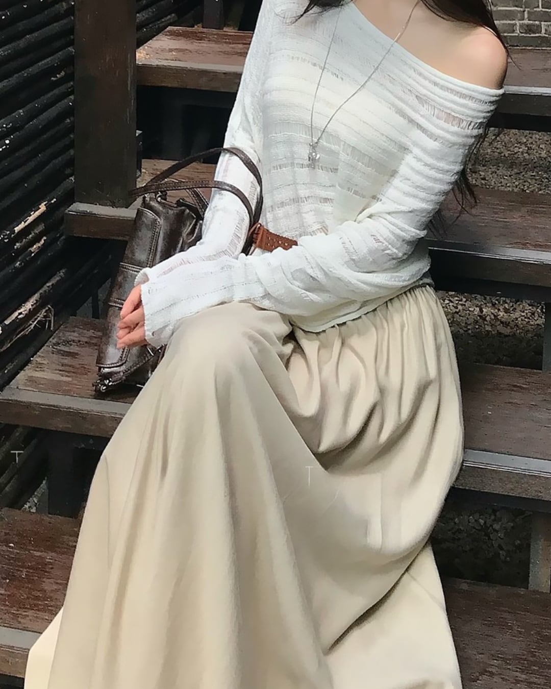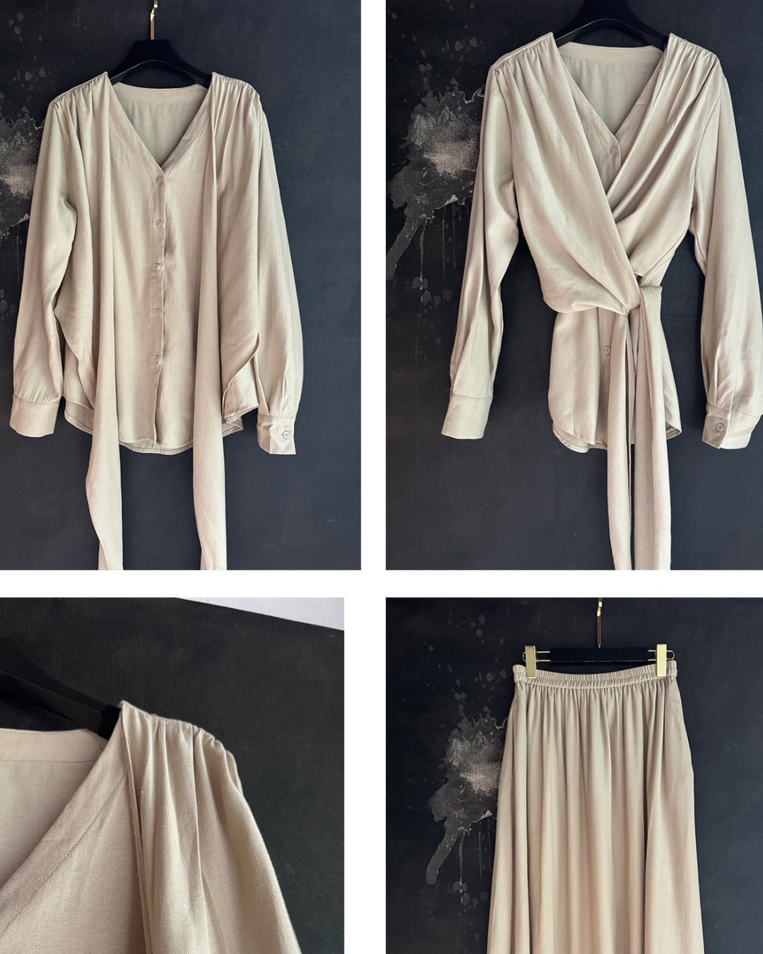 ナチュラルな風合いが魅力のリネンブレンド素材を使用したセットアップ。クロスデザインのシャツはウエストマークでスタイルアップ効果抜群。軽やかなロングスカートと合わせて、リラックス感と上品さを兼ね備えた大人のスタイルに。