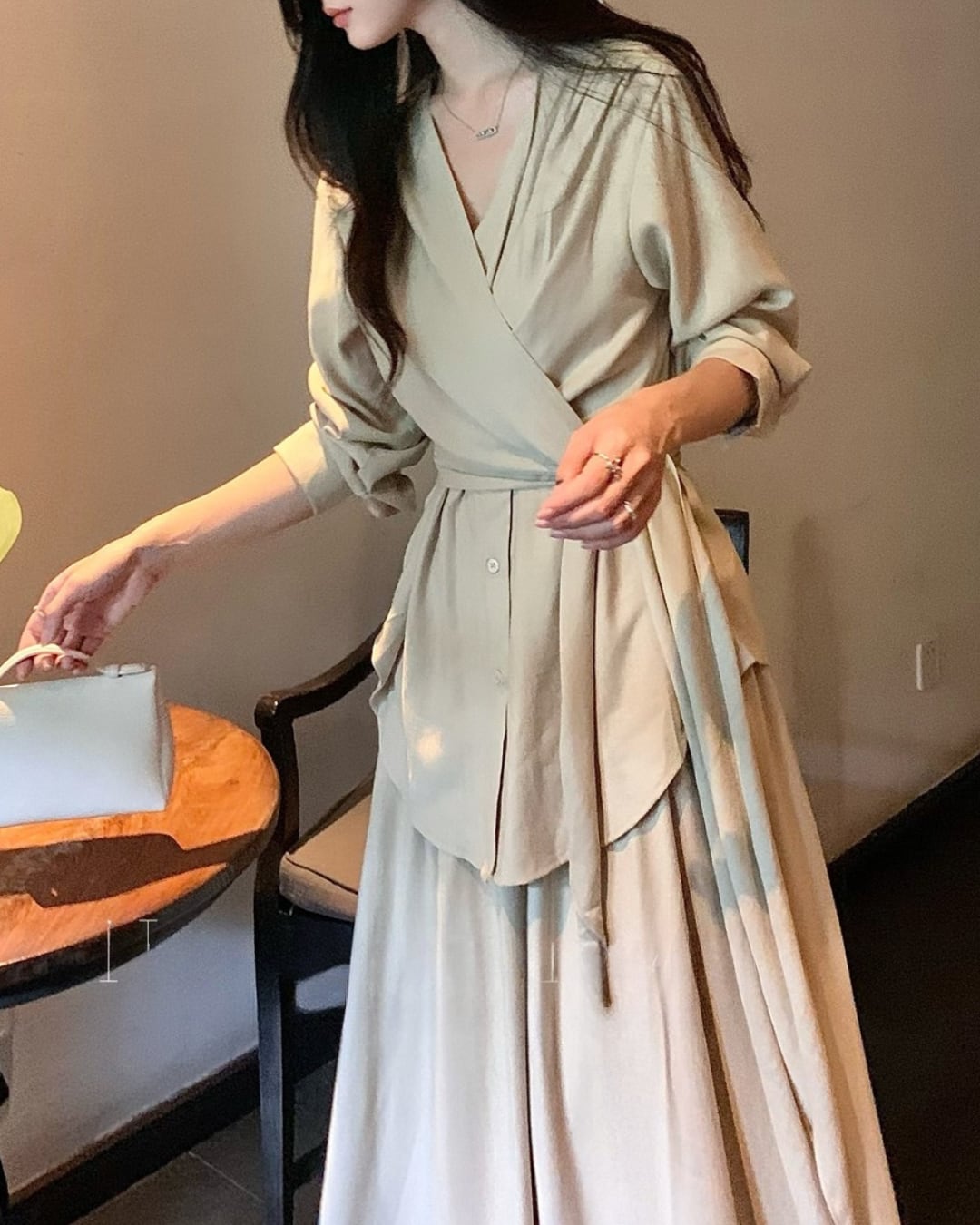 #リネン #セットアップ #ラップシャツ #ロングスカート #ウエストマーク #カーキベージュ