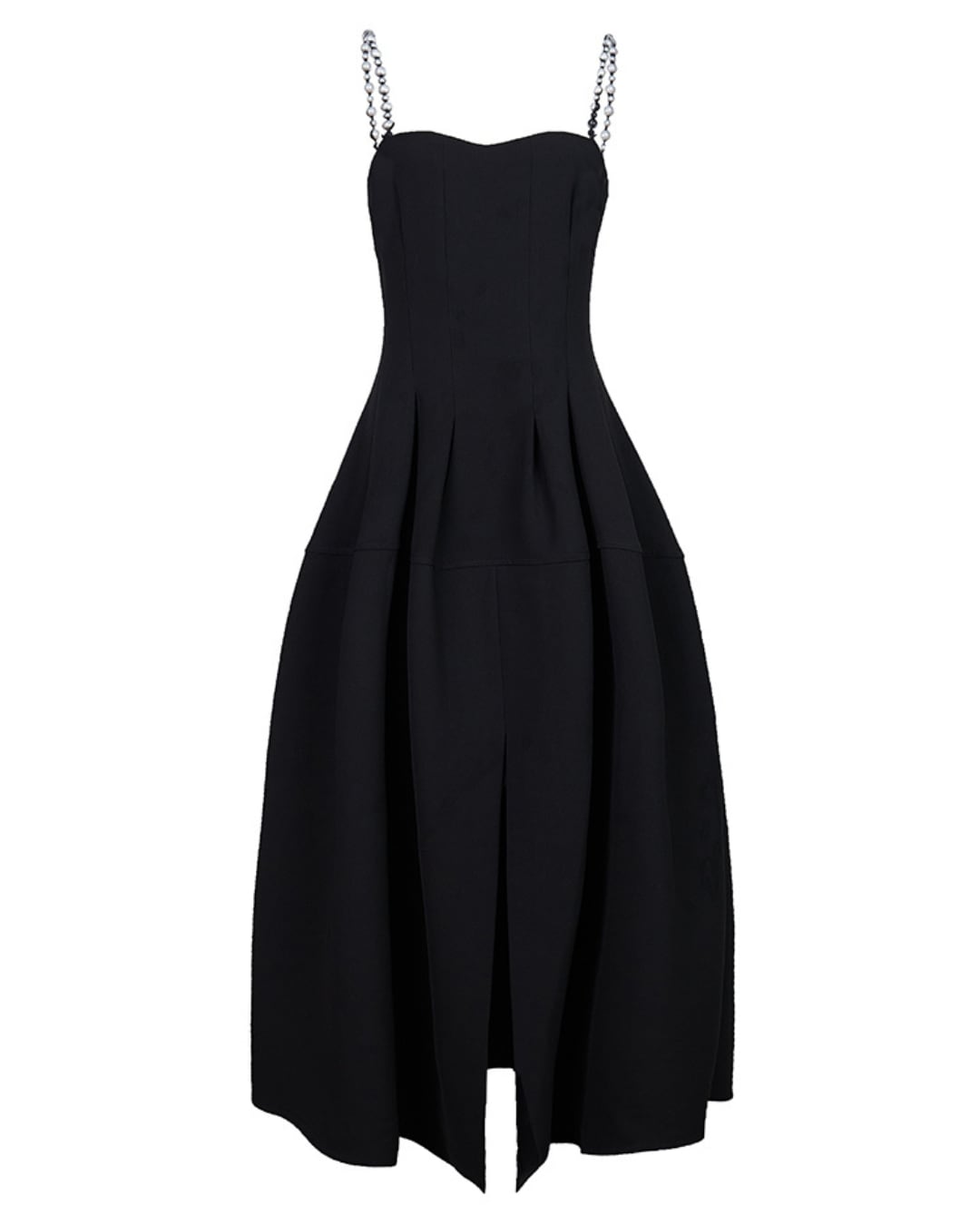 クラシカルな雰囲気が漂うブラックドレス。肩のパールストラップが上品な輝きを添え、華奢なデザインながらも美しい立体シルエットを演出します。フロントスリットで抜け感をプラスし、フォーマルシーンやディナーなどにもぴったりの一着です。
