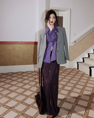 ランダムに配置されたスパンコールが華やかさをプラスするロングスカート。しなやかな落ち感のある生地で、動くたびにきらめきを演出。ウエストは紐で調整可能なイージー仕様で、リラックス感のある着心地も魅力。カジュアルなGジャンと合わせても上品に仕上がる万能アイテム。