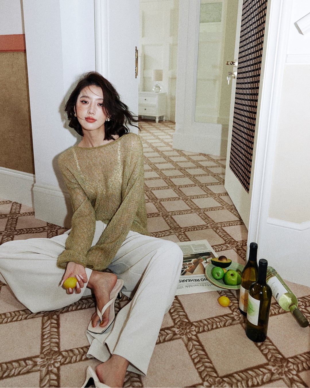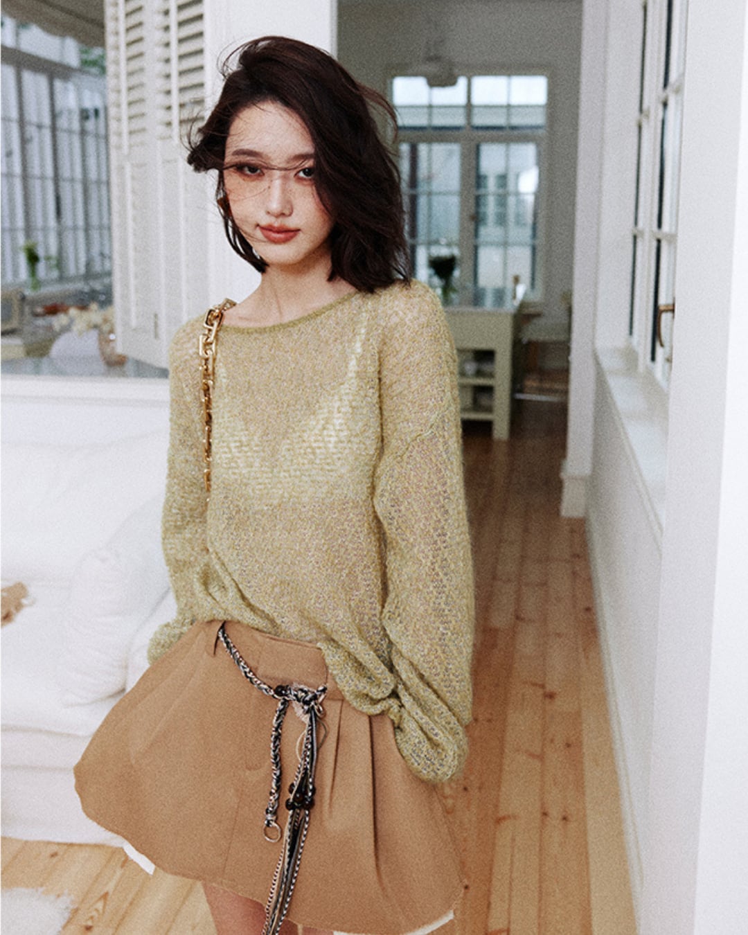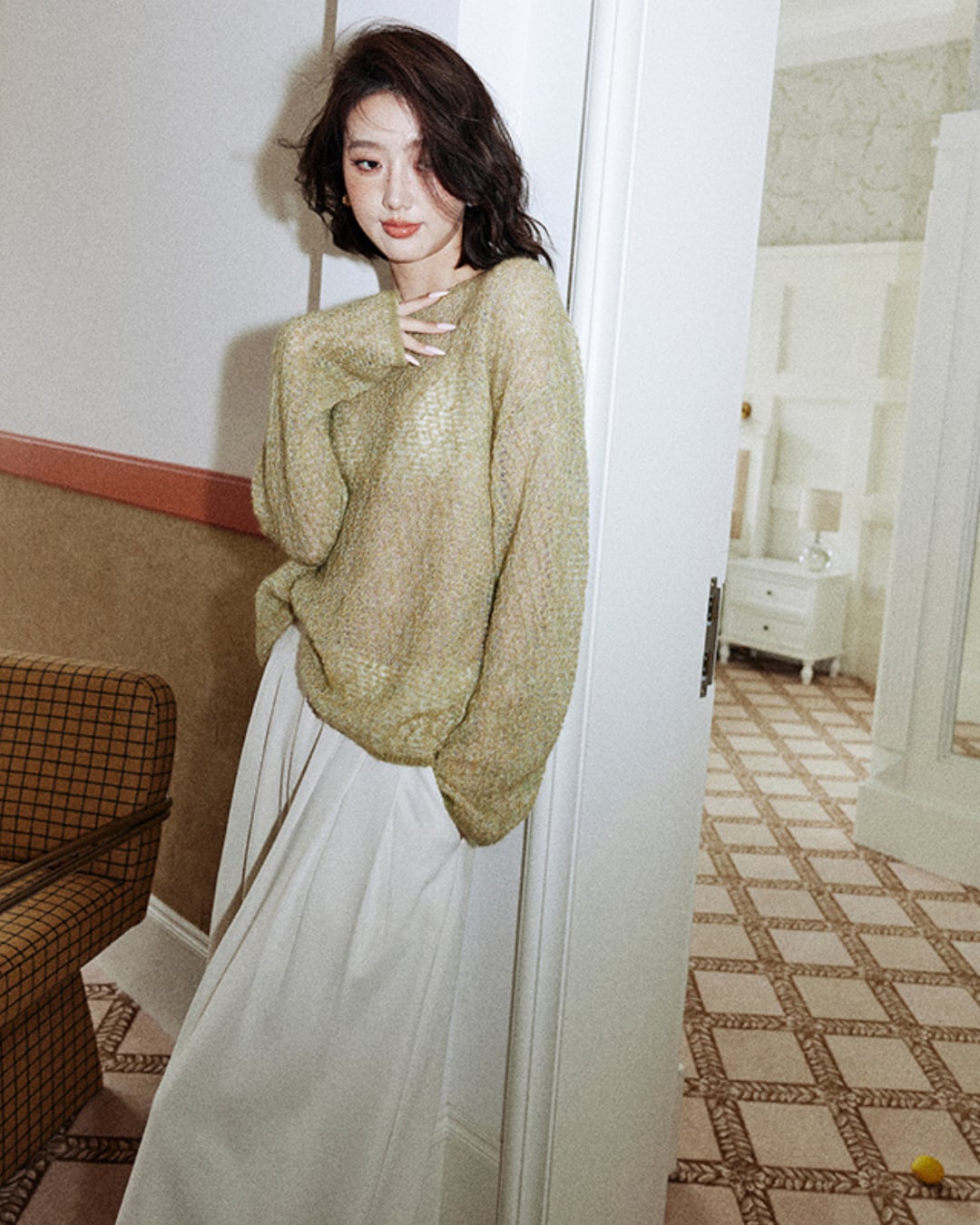#透け感ニット #シアーニット #レイヤード #フェミニンスタイル #イエローニット #ローズバンクス
