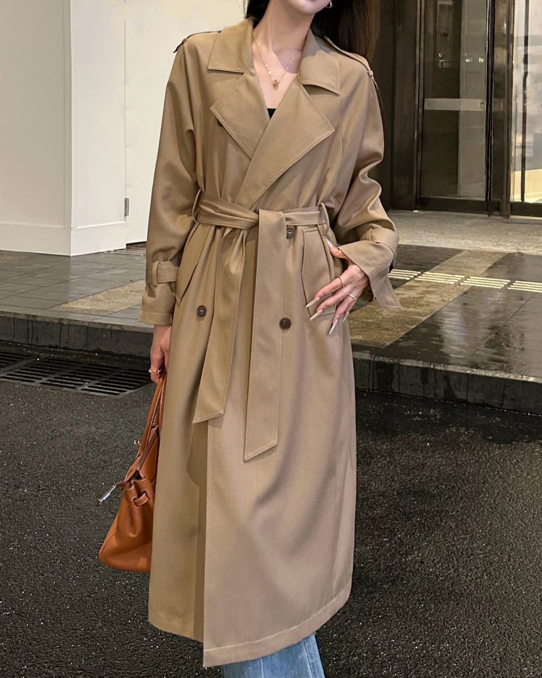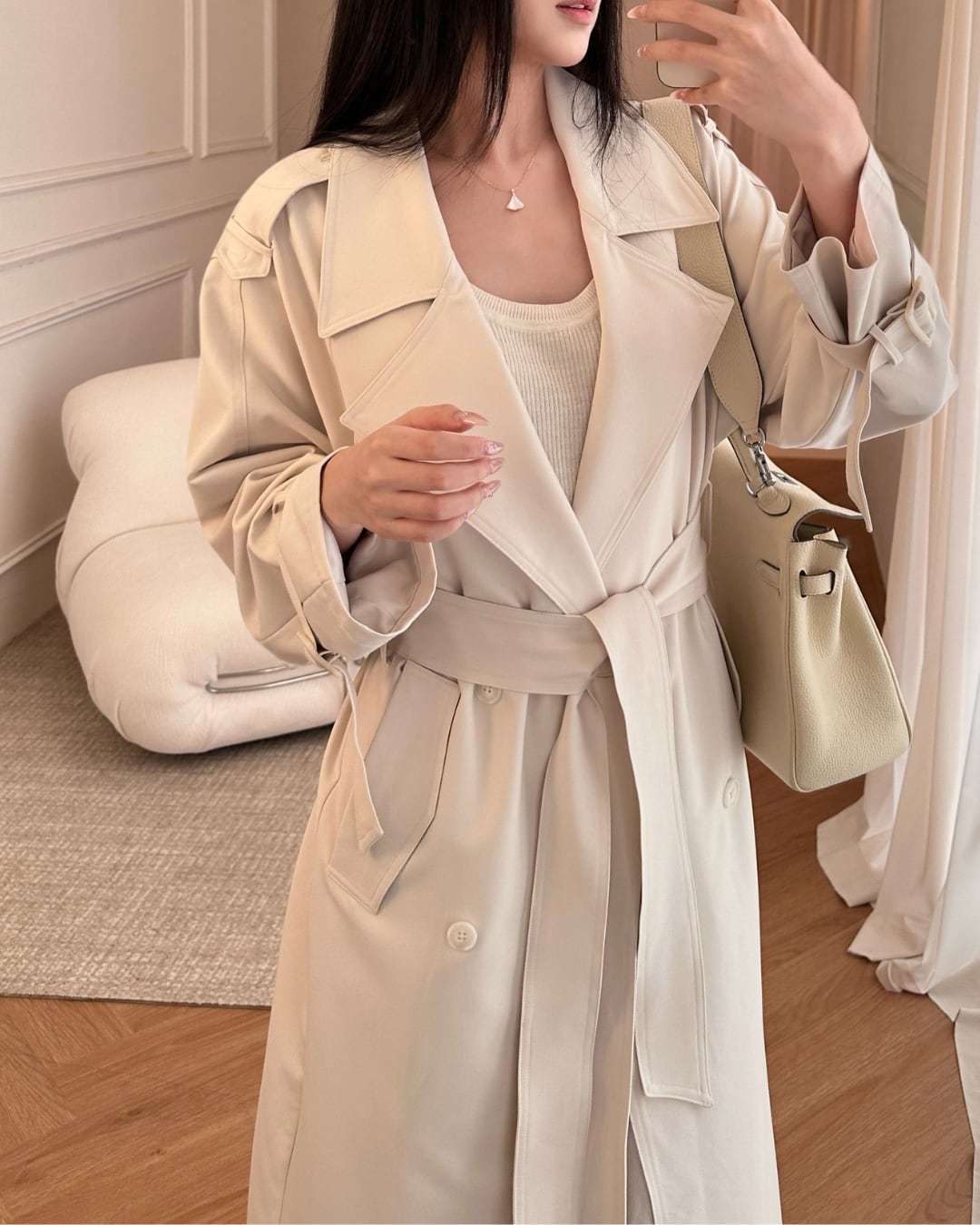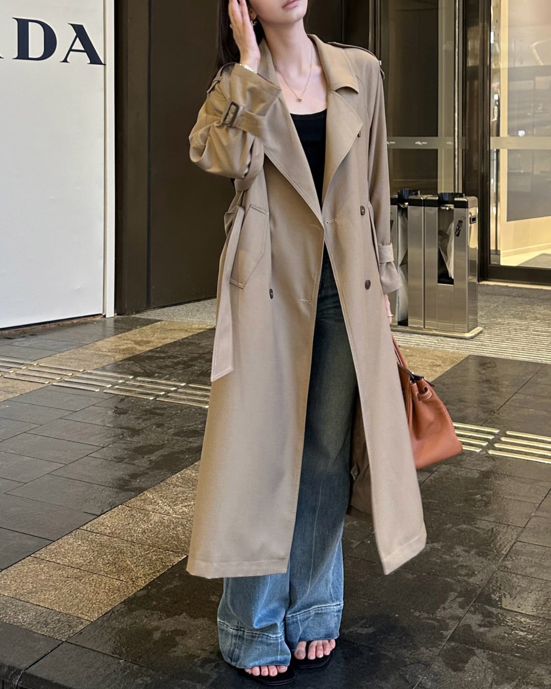 羽織るだけでスタイルが決まる、大人のためのロングトレンチコート。ゆったりとしたシルエットと落ち感のある素材が上品な印象を与え、ワンピースやデニム、通勤スタイルにもマッチする万能アウター。シンプルながらも女性らしさを引き立ててくれる一着です。