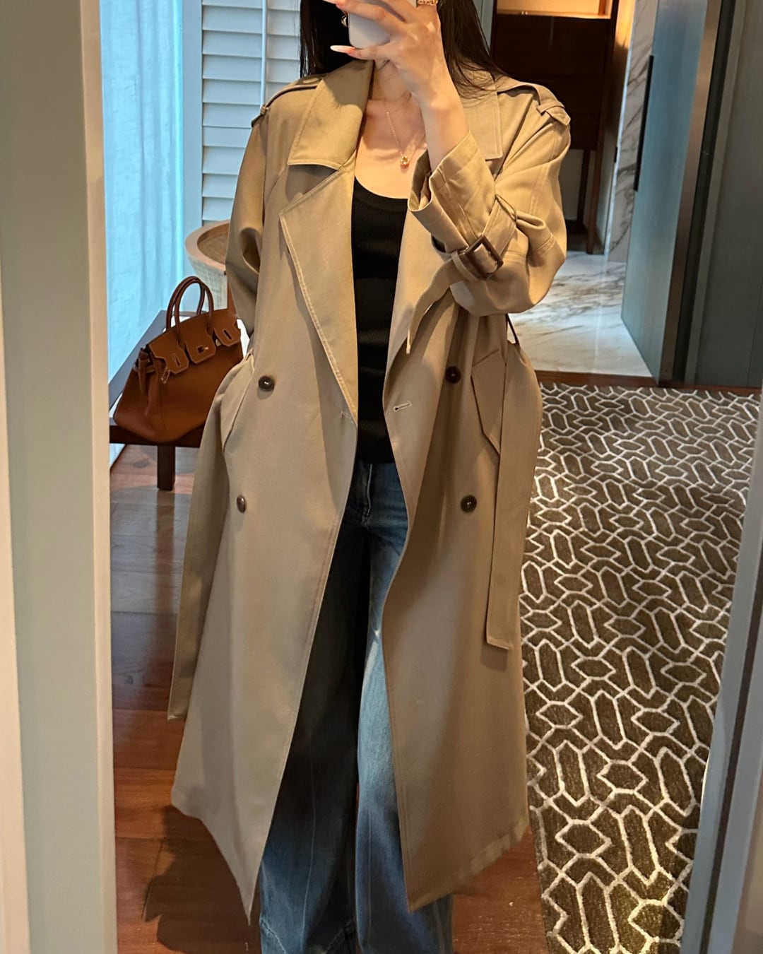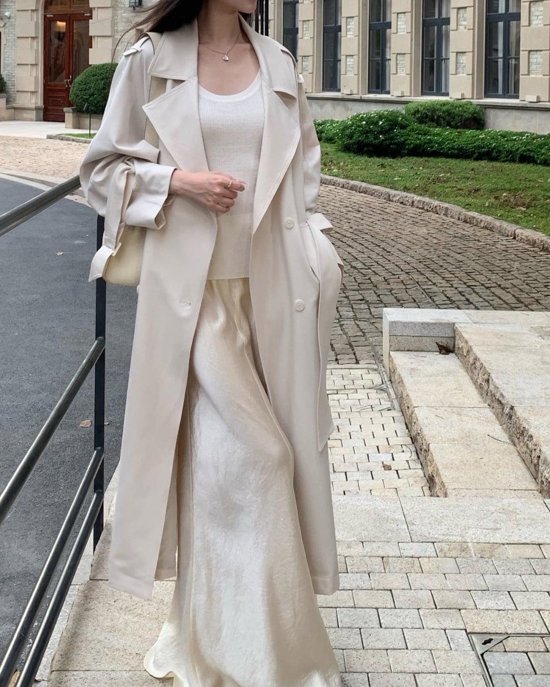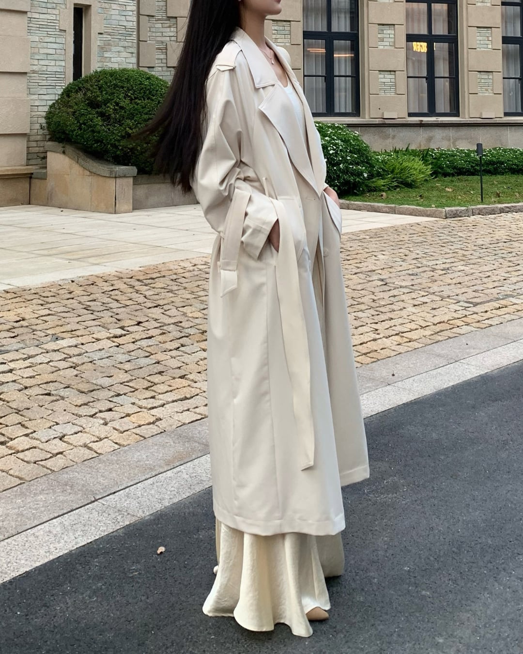 羽織るだけでスタイルが決まる、大人のためのロングトレンチコート。ゆったりとしたシルエットと落ち感のある素材が上品な印象を与え、ワンピースやデニム、通勤スタイルにもマッチする万能アウター。シンプルながらも女性らしさを引き立ててくれる一着です。