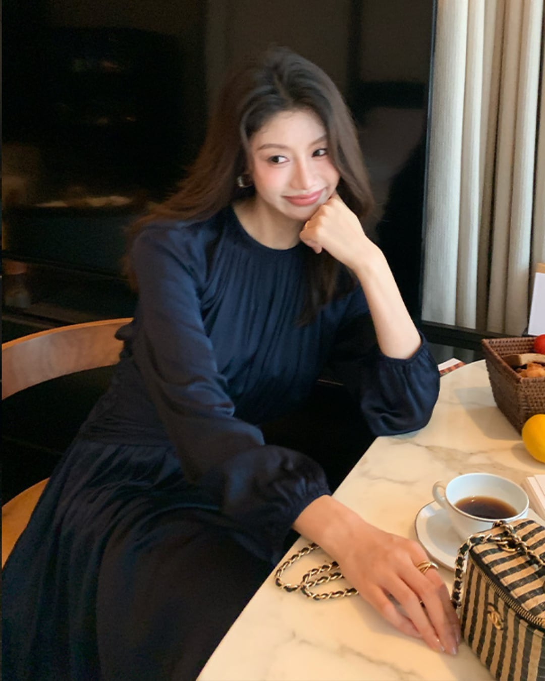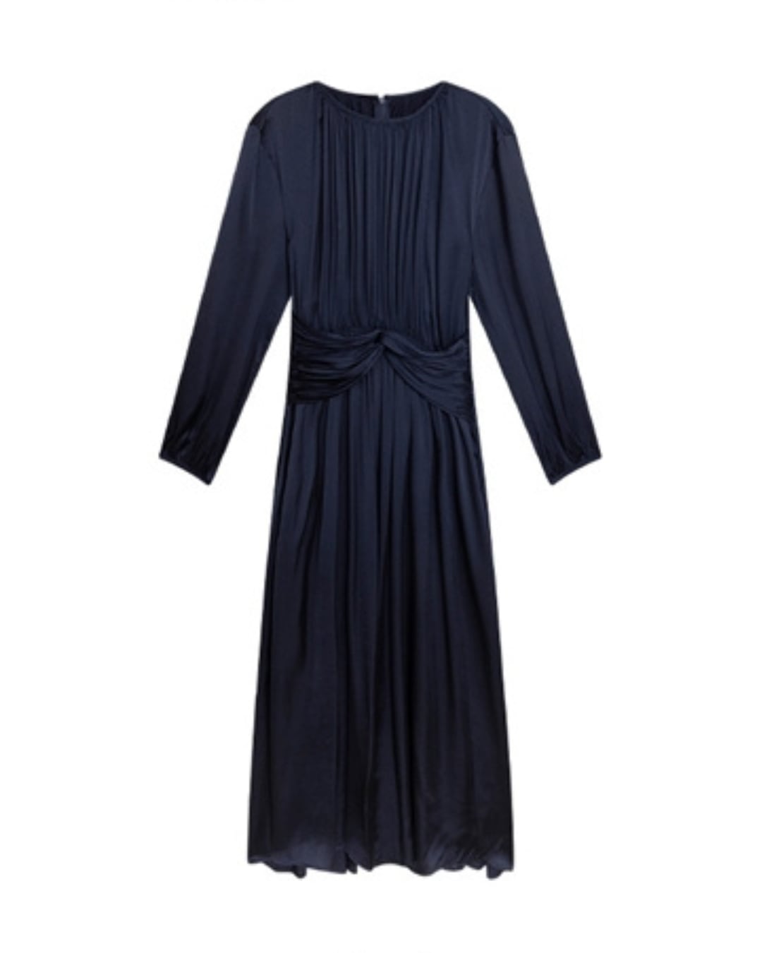 #ロングワンピース #ギャザーデザイン #フレンチスタイル #ネイビーコーデ #秋ワンピース #エレガント