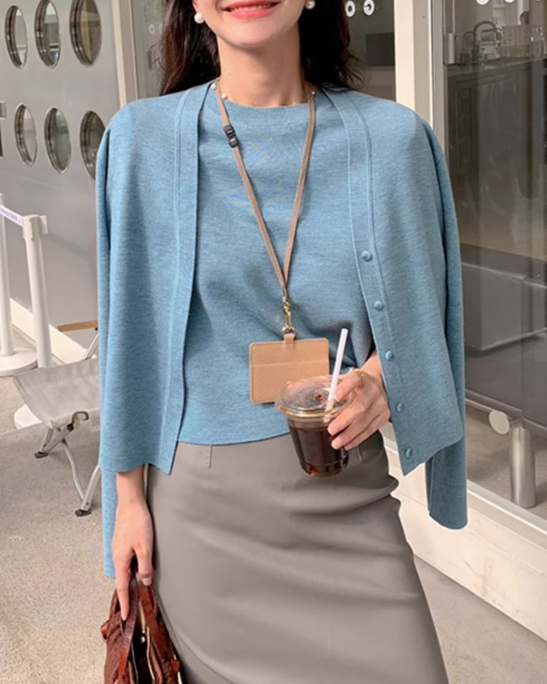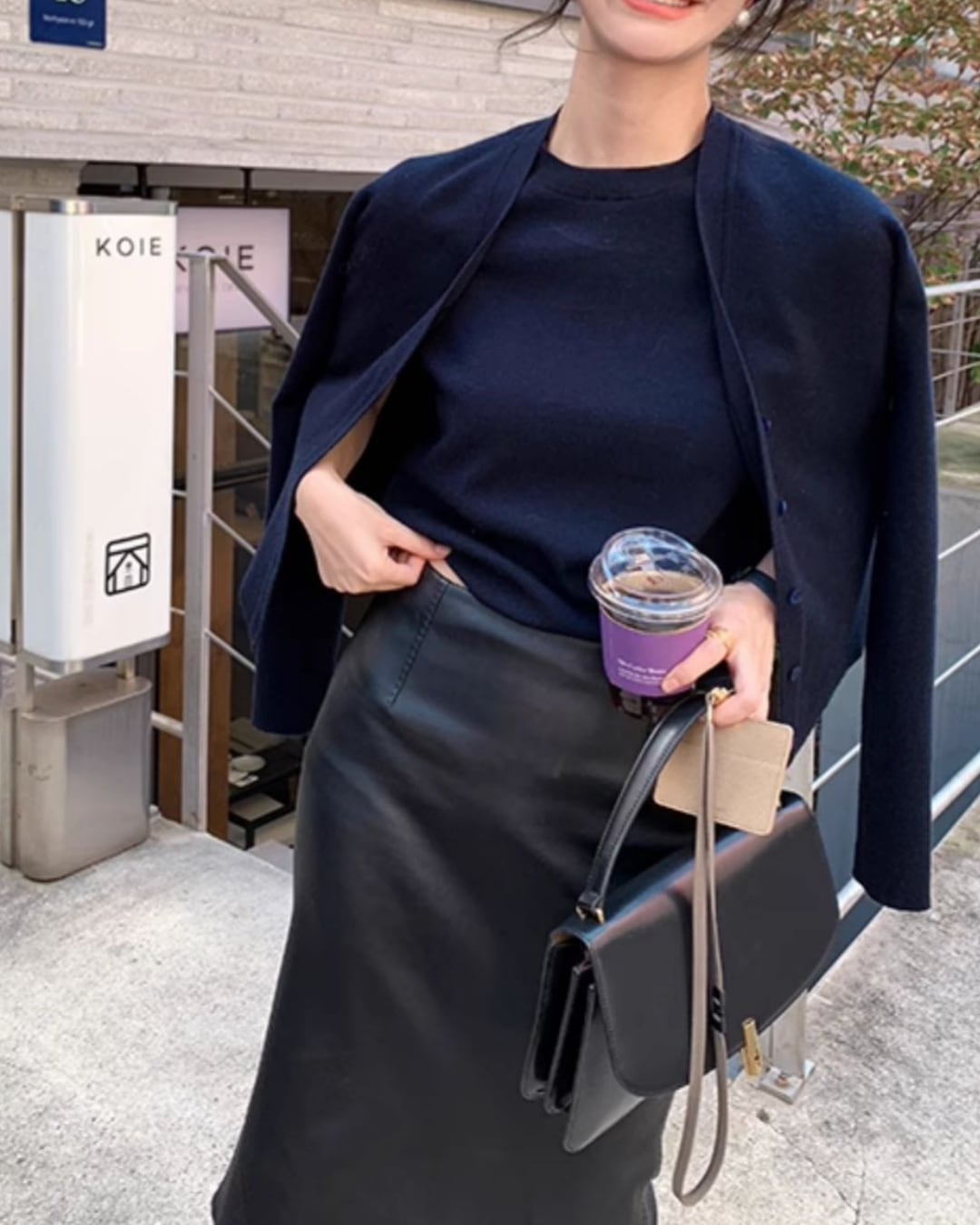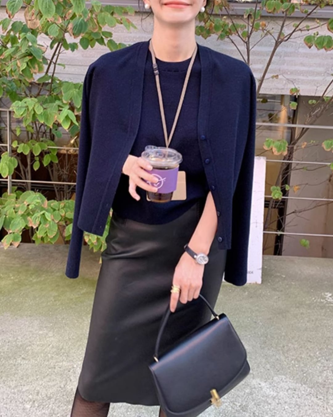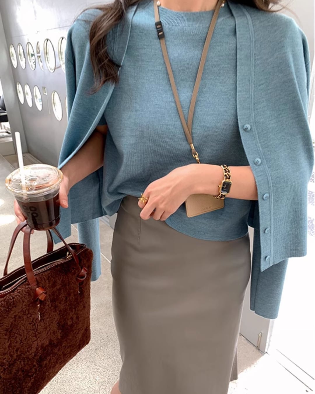 上品な光沢感と滑らかな肌触りが魅力のウールニットセット。カーディガンとインナーは同色で統一感があり、大人のカジュアルスタイルにぴったり。カフェタイムやデイリーコーデにさらっと着こなせる、春に最適な軽やかさ。