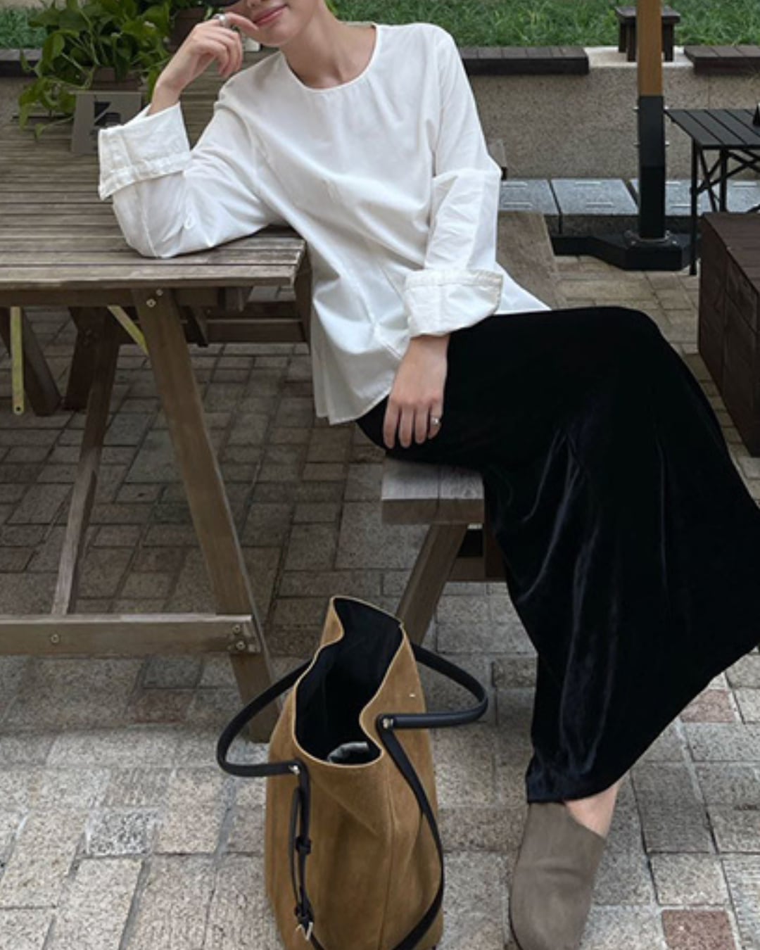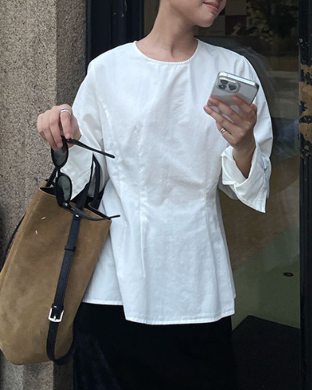 滑らかな肌触りが魅力のコットン混ラウンドネックトップス。袖口のさりげないタックデザインや、ややゆとりのあるシルエットでリラックス感のある着こなしが叶います。パンツにもスカートにも合わせやすく、秋のデイリーにぴったりな1枚。ナチュラルで抜け感のあるホワイトカラーが、着こなしを上品に仕上げてくれます。