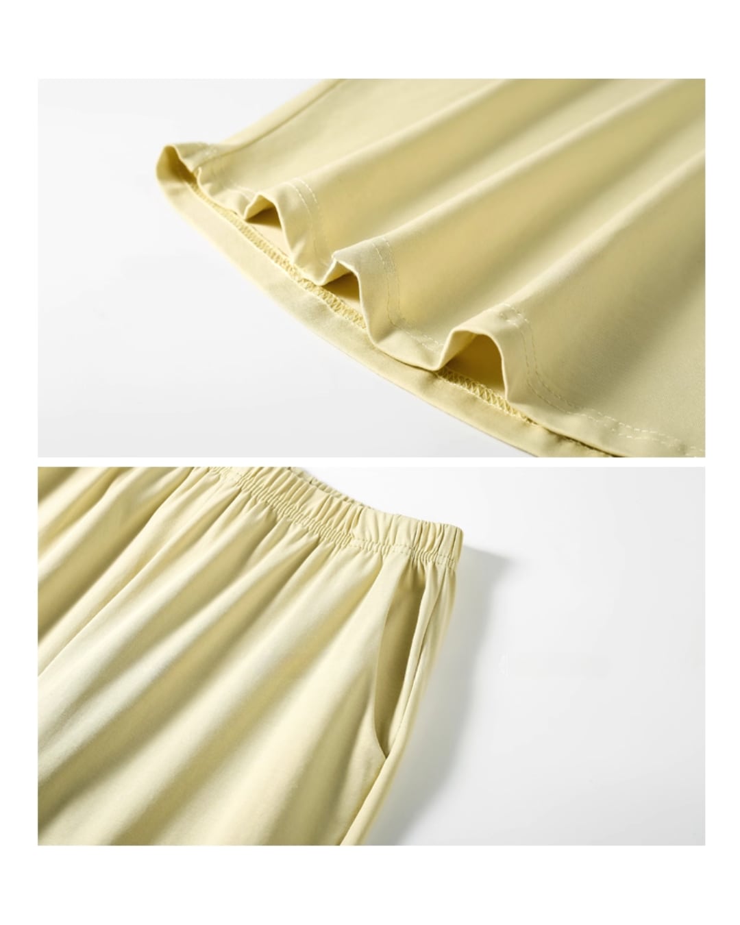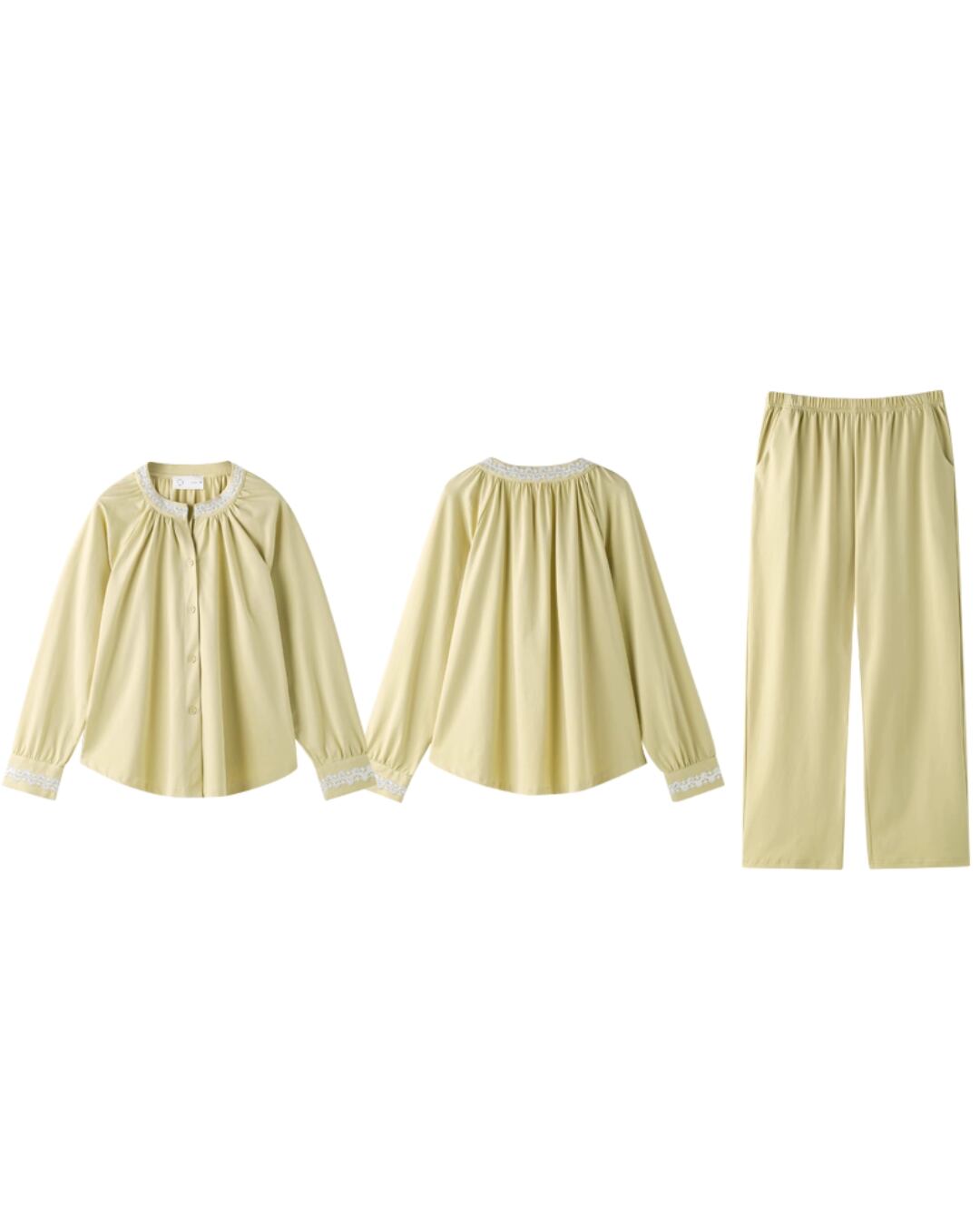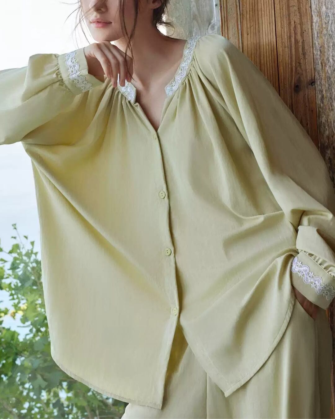 ふんわり柔らかいコットン混素材で仕立てた、大人の抜け感を演出するルームウェアセット。ゆったりとしたスリーブとレースの襟元が上品で、フェミニンな雰囲気をプラス。ナチュラルなライムグリーンのカラーは、リゾートや休日のリラックスタイムにもぴったり。締め付け感のないストレスフリーな着心地で、毎日を優雅に。