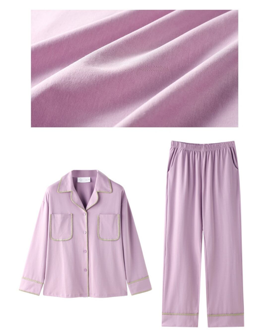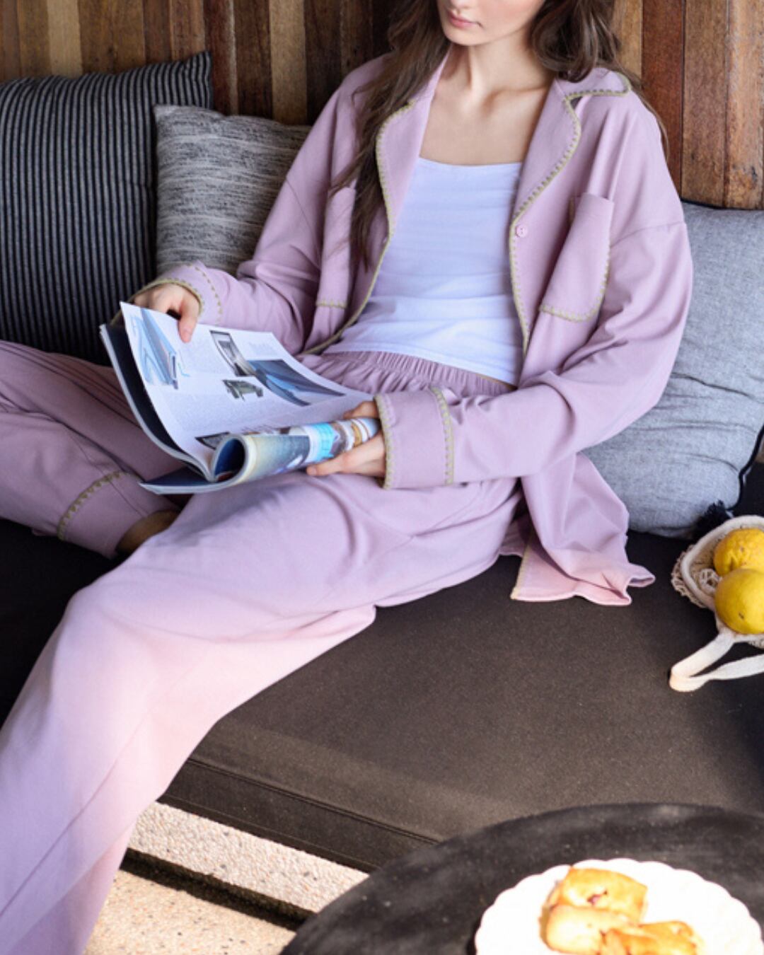 大人可愛いラベンダーカラーに、配色ステッチが映えるルームウェアセット。柔らかなコットンにストレッチを効かせた素材で、肌触りも動きやすさも抜群です。ゆったりシルエットが心地よく、おうち時間を快適に彩ります。胸元のポケットやシンプルなパンツラインで、リラックスと上品さを両立したデザインです。