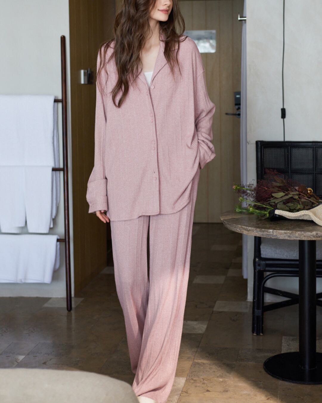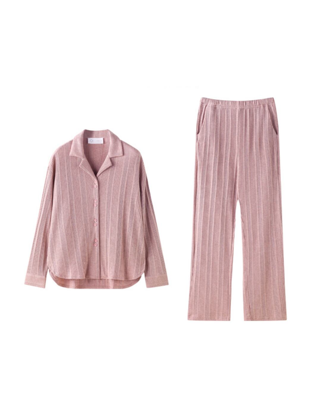 さりげないストライプ調のリブ素材が特徴的なルームウェア。落ち着いたピンクカラーで、大人の可愛さと上品さを演出します。さらりとした素材で肌触りが良く、快適な着心地。シャツタイプのトップスとストレートパンツのセットアップは、おうち時間やリラックスタイムにぴったりの一着です。