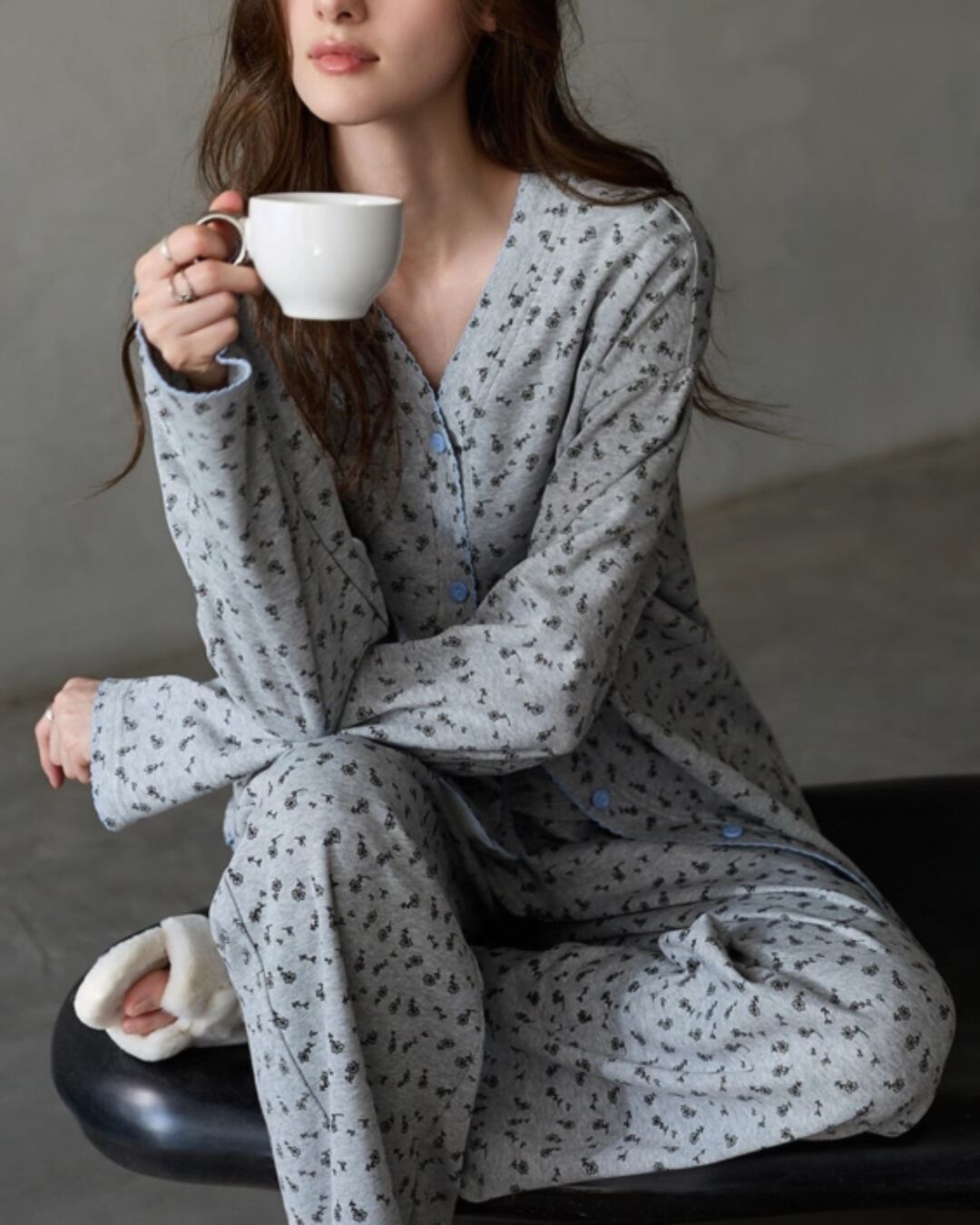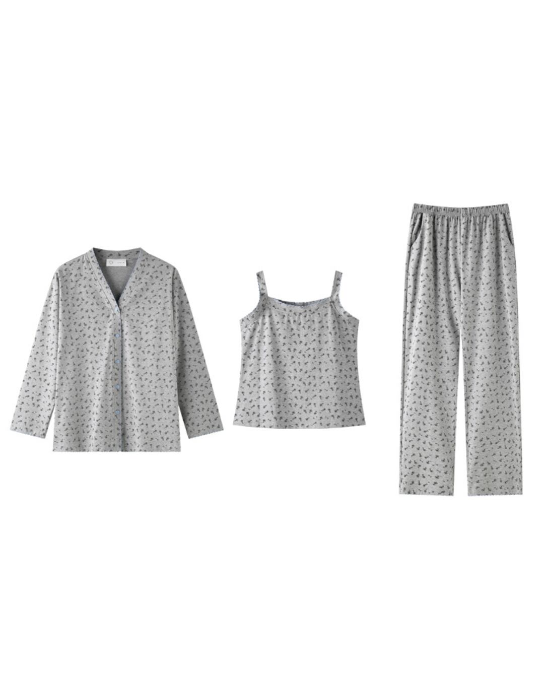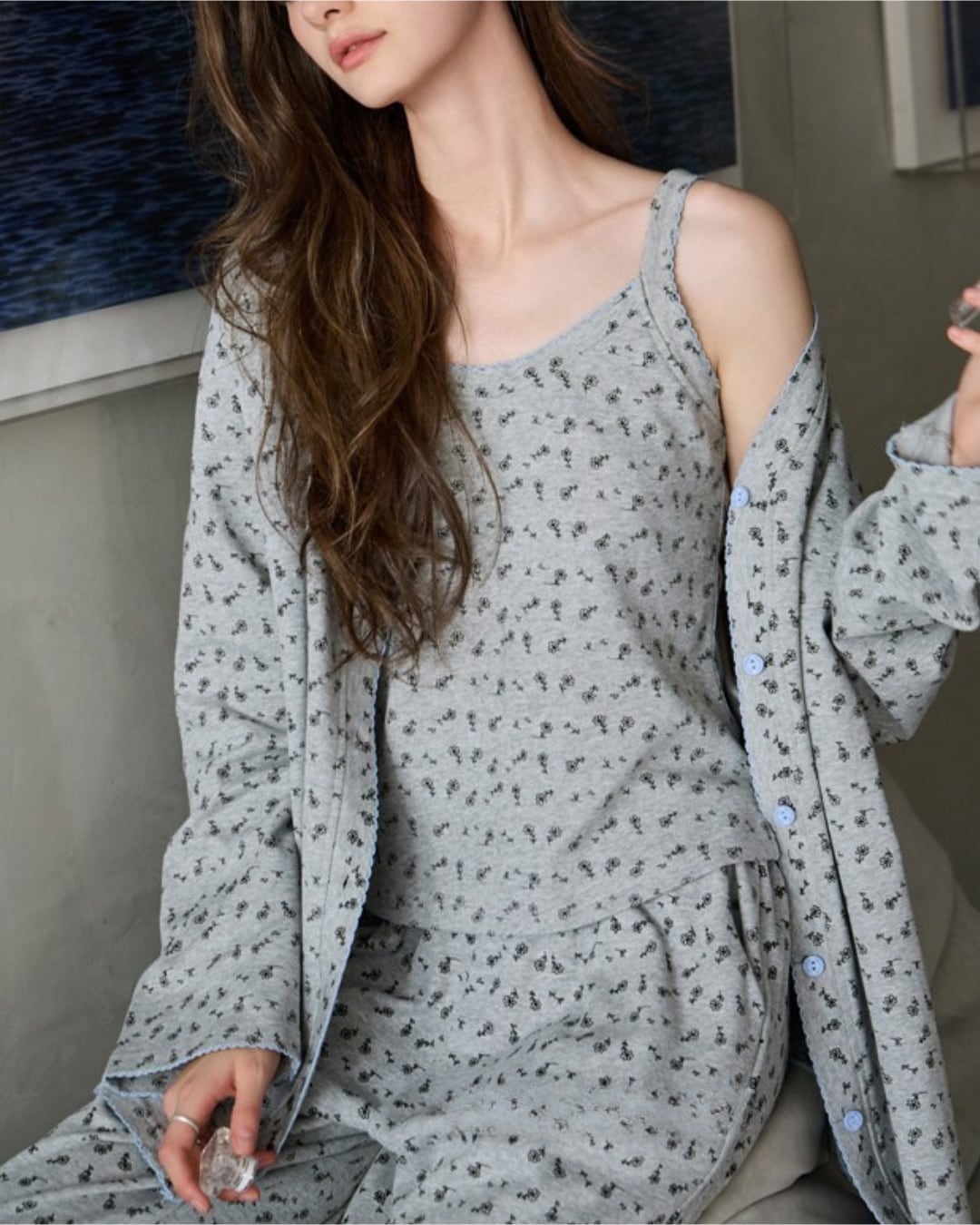 ナチュラルな花柄が魅力のルームウェア3点セット。通気性と肌触りに優れたコットン素材で、快適なおうち時間を演出します。キャミソール、カーディガン、パンツのセットで季節を問わず活躍するアイテムです。