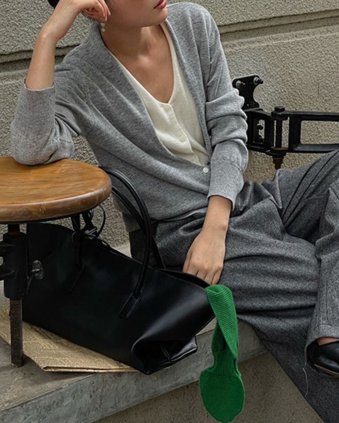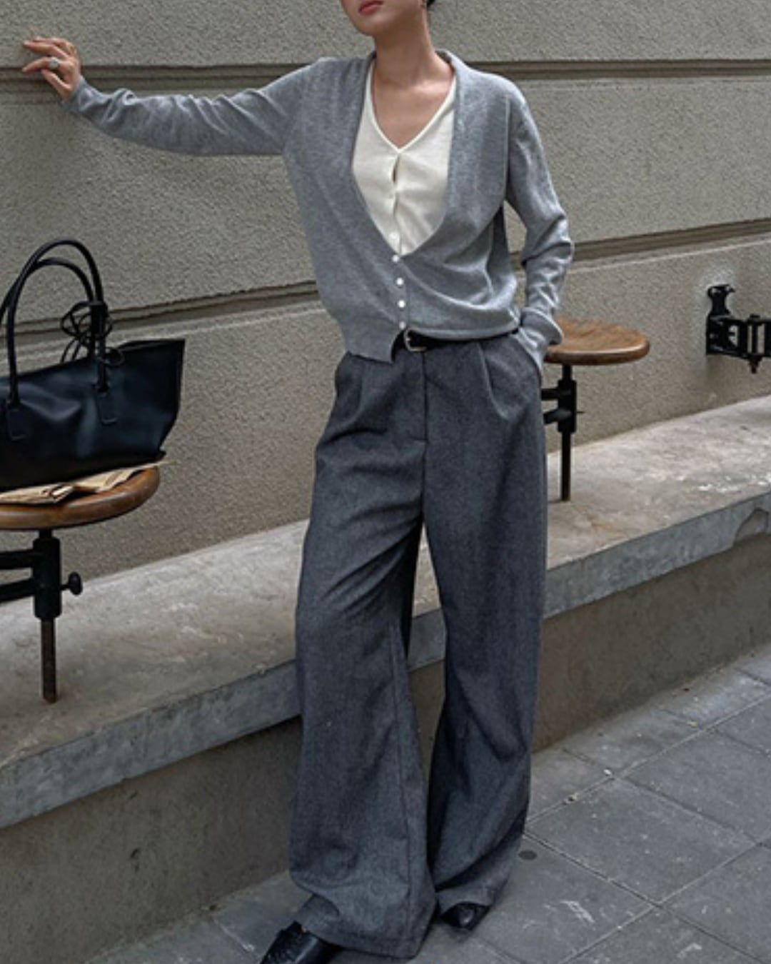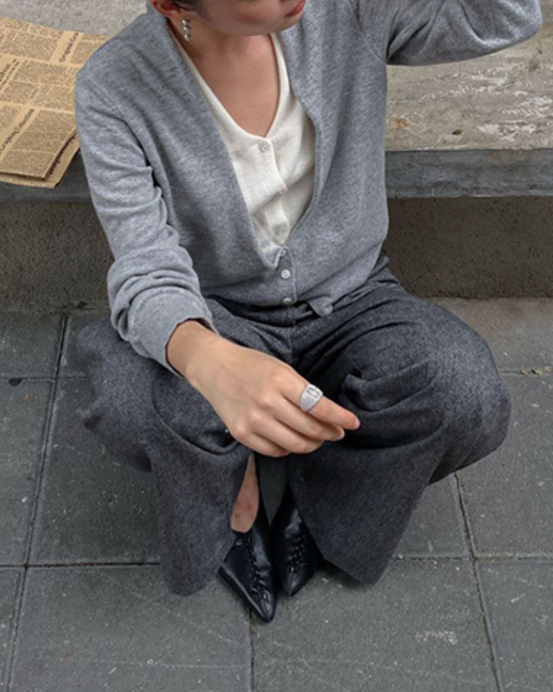 #メリノウール #ライトグレー #カーディガンコーデ #通勤スタイル #Vネック #上質ニット