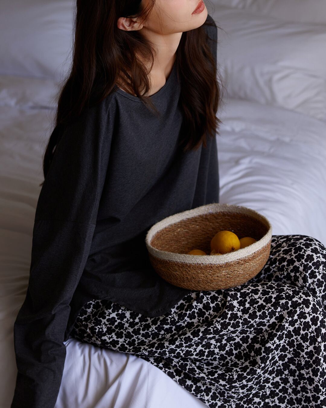 リラックス感たっぷりのルームウェアセット。トップスは柔らかなチャコールグレーのロングスリーブ、パンツは花柄モチーフのリラックスワイドシルエット。お家時間もおしゃれに、気分を上げてくれる1着です。