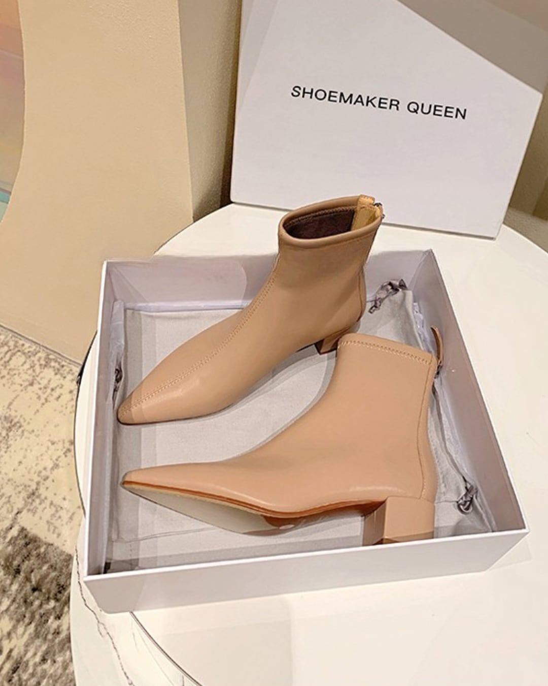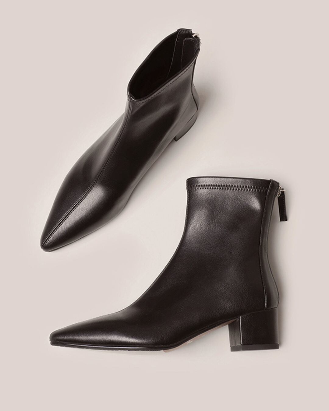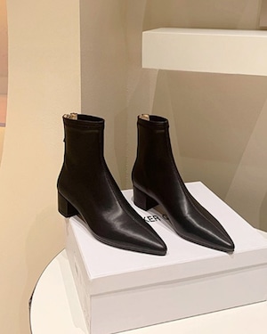 秋冬コーデにぴったりの美脚ショートブーツ。小尖頭と約4.5cmの安定感のある太ヒールが脚長効果を演出。柔らかく高級感のある輸入羊紋ストレッチレザーを使用し、足にフィットしながらも快適な履き心地を実現。ストレートパンツやワンピースなど、どんなコーデにも合わせやすく、大人のこなれ感をプラスしてくれる一足です。
