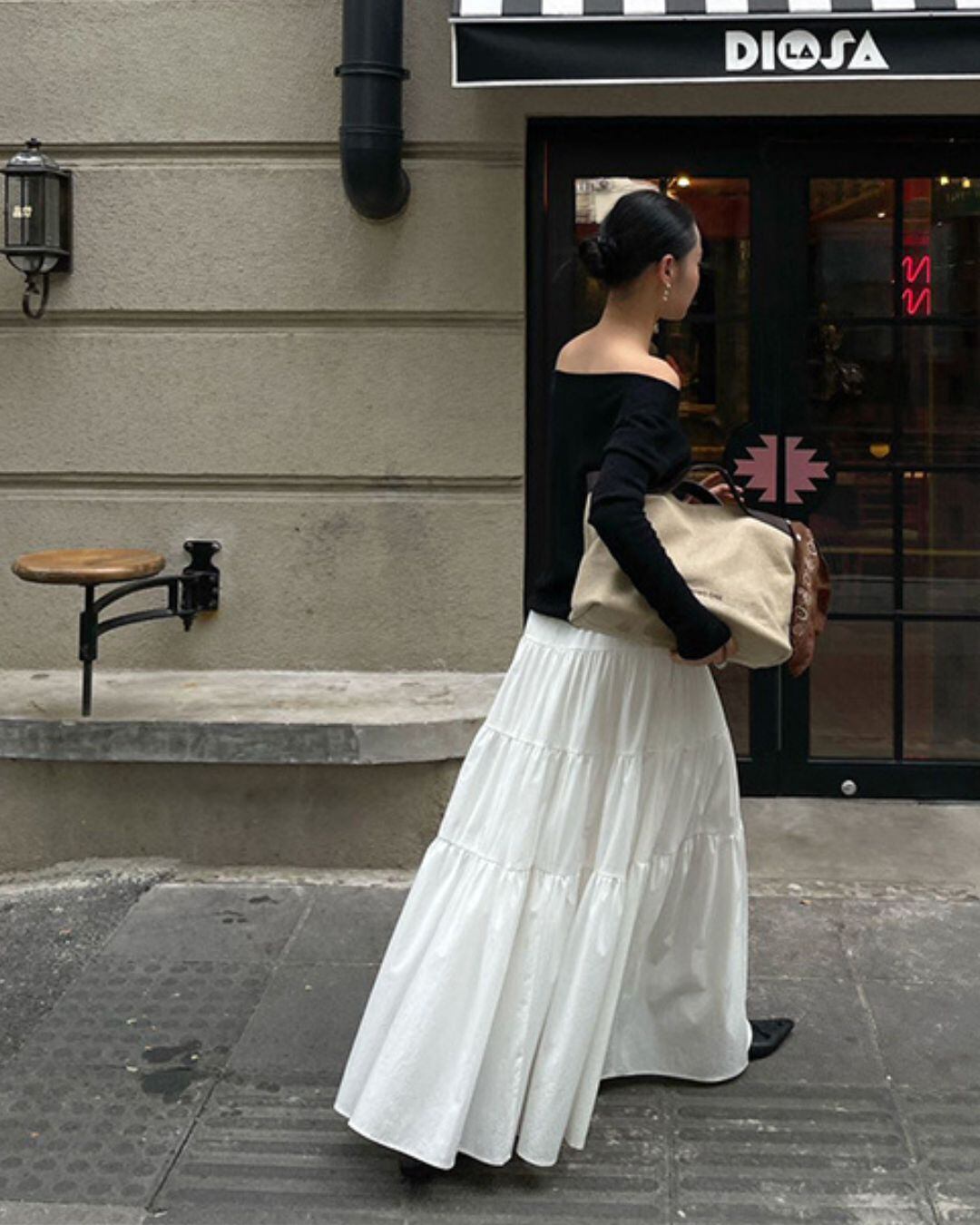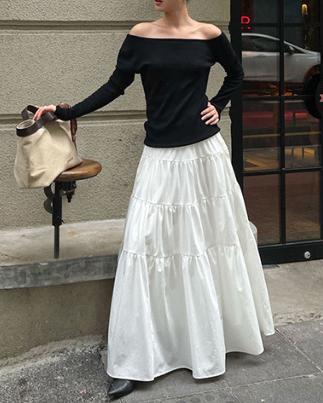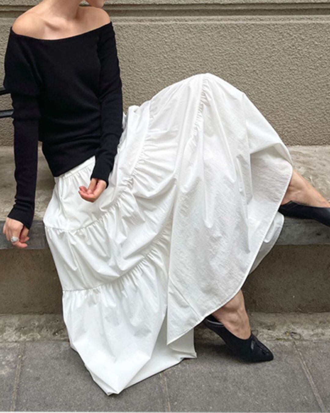 #ティアードスカート #ロングスカート #ウエストゴム #ホワイトコーデ #フェミニン #大人カジュアル