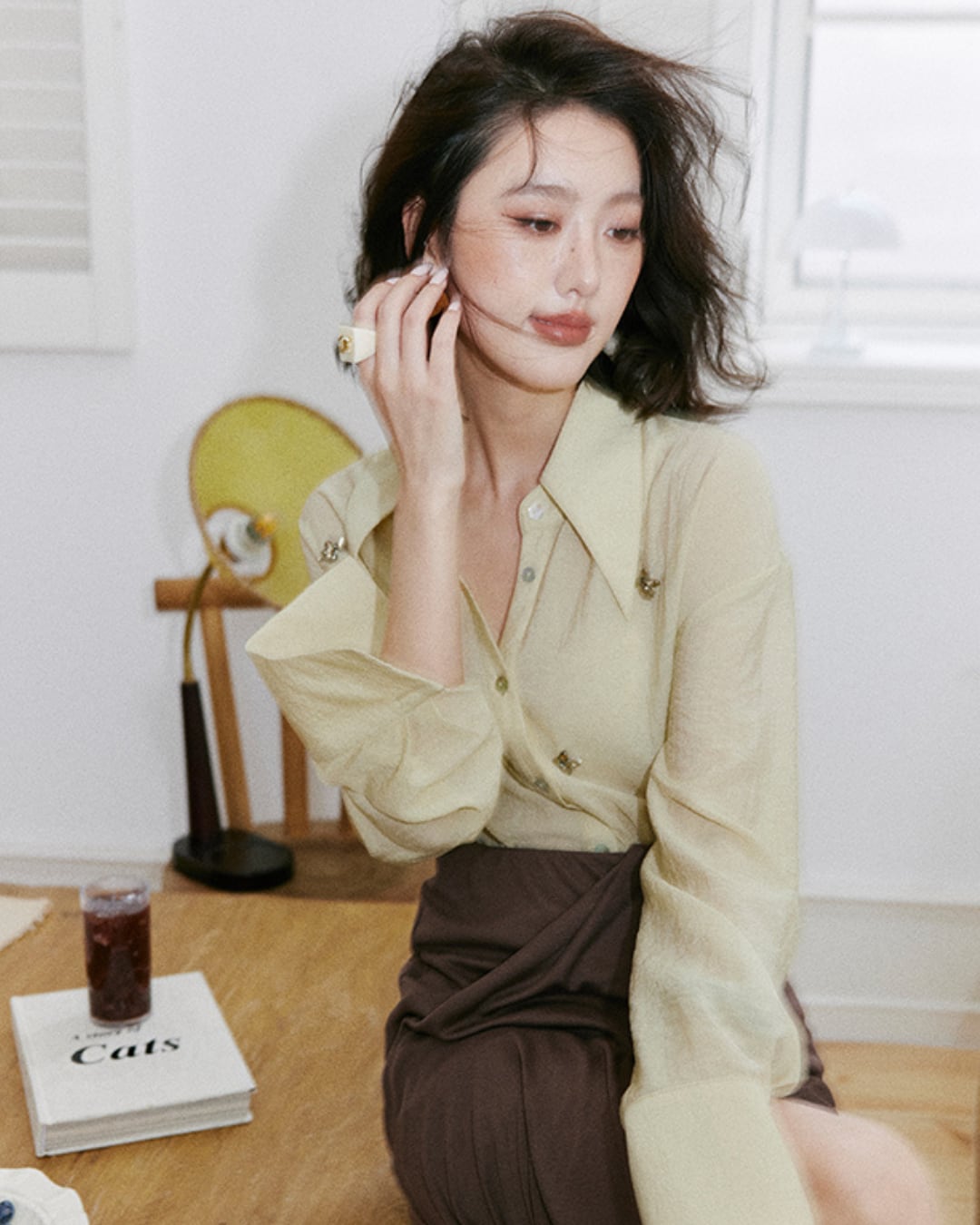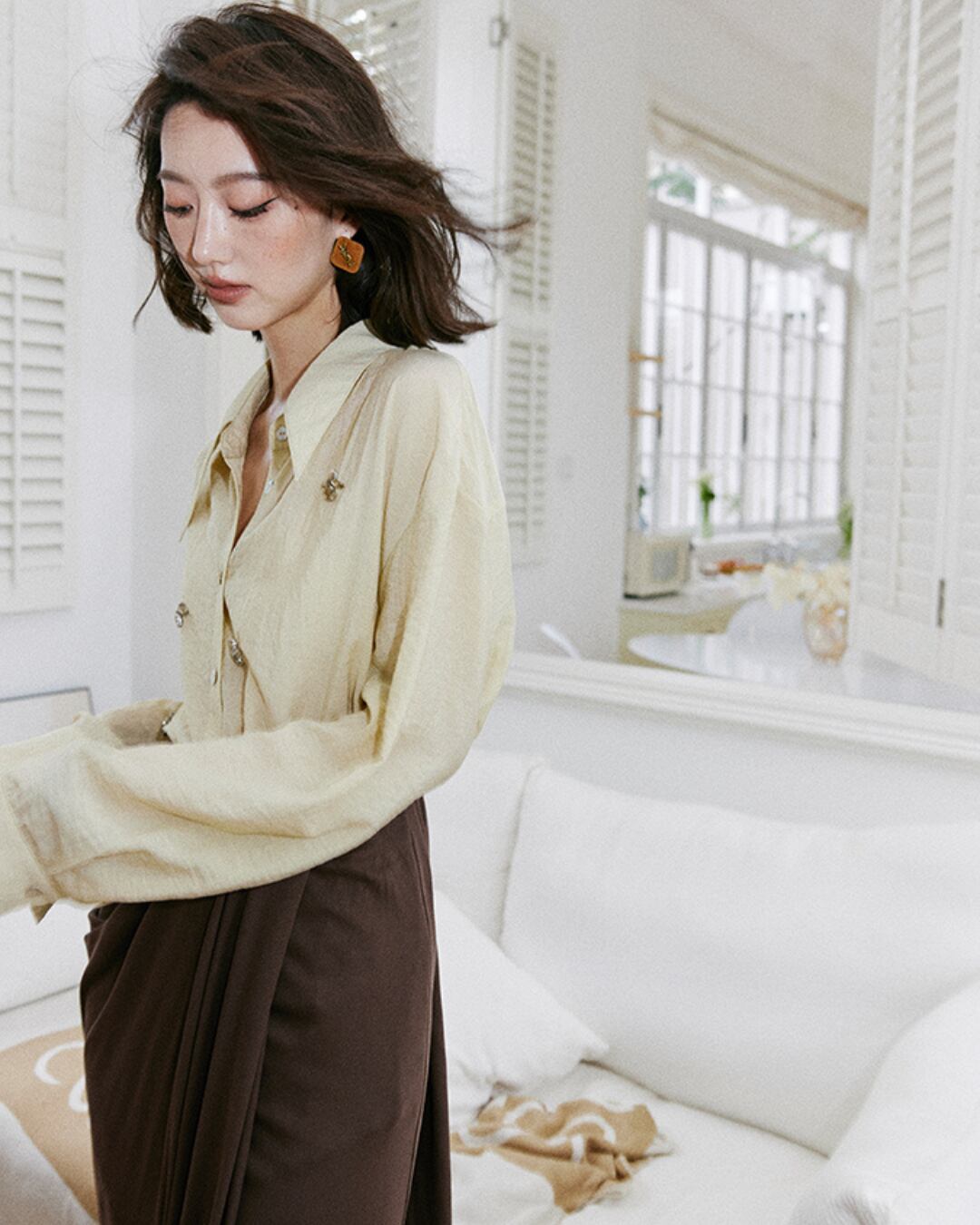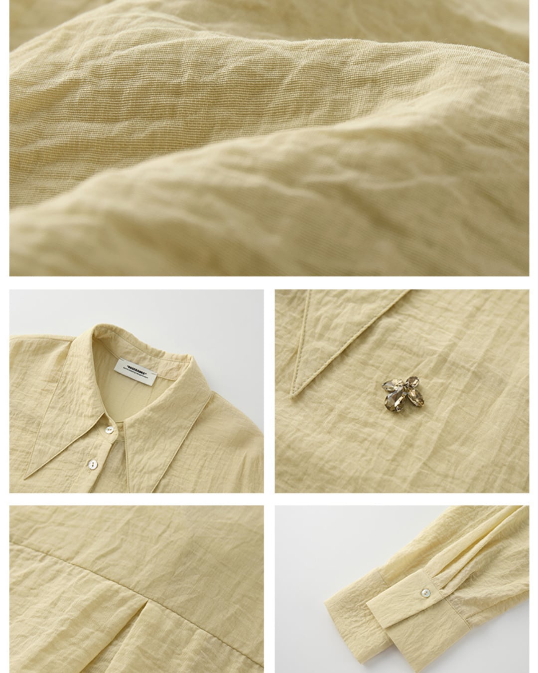 #ビジューシャツ #ロングスリーブ #フレンチスタイル #シャツコーデ #ソフトイエロー #フェミニンコーデ
